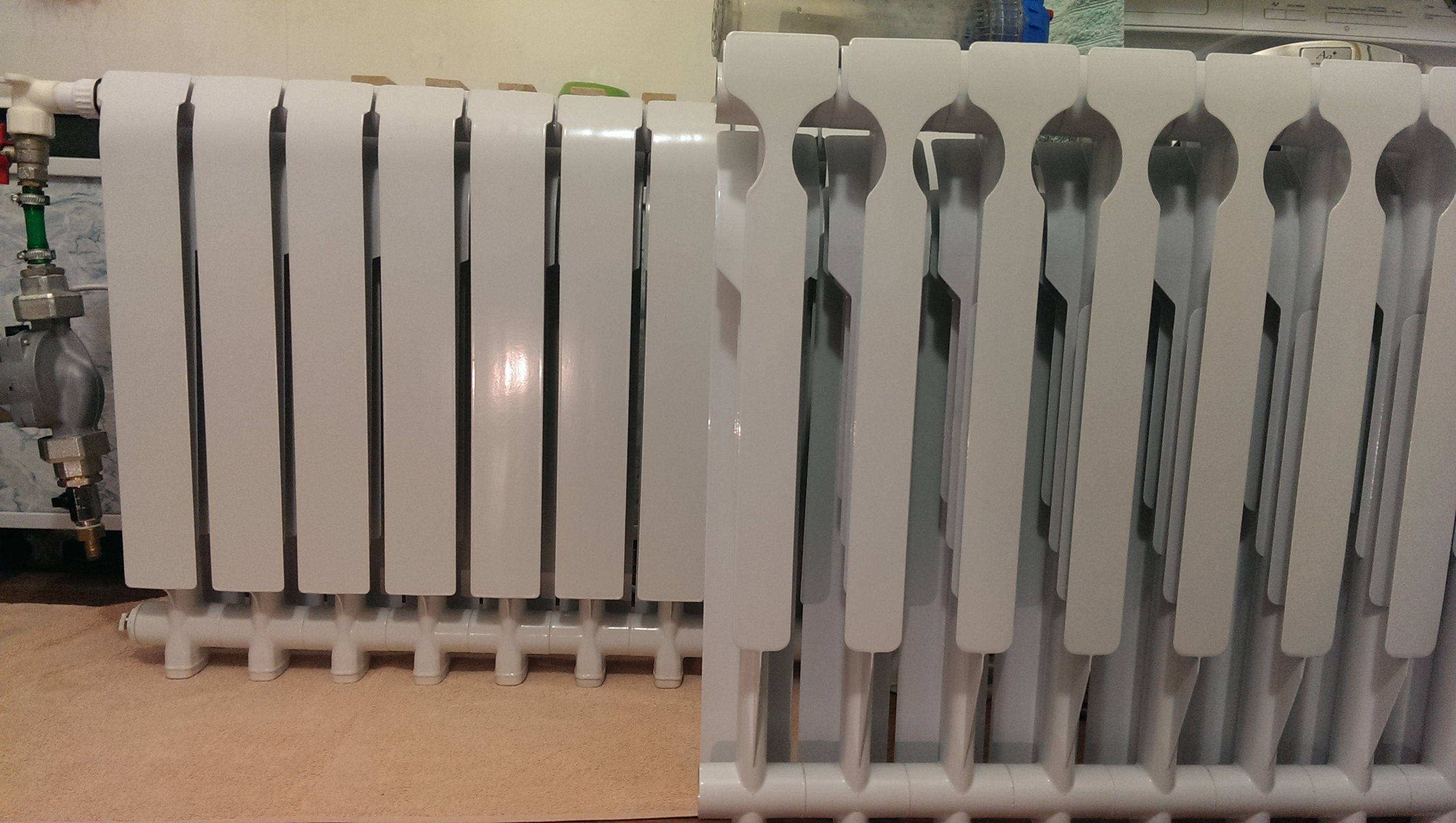 Я не знаю о каких обычных двух секциях идет речь, но вооружившись элементарным измерительным инструментом вы можете измерить площадь поверхности хотя бы примерно, без учета поперечных трубок. Если измерить не получится, то нужен хотя бы геометрический размер радиатора и количество пластинок. У меня вот такой радиатор AL 500/100: http://tenrad.ru/radiator-aljuminievyj.shtml Из таблицы видно, что площадь поверхности одной большой секции составляет внушительные 1,322 квадратных метра. Попробуйте найти справочное значение площади на ваш альтернативный вариант и сравнить. Продувать радиатор отопления очень легко из-за большой площади сечения воздушных каналов, собственно они проектировались на пассивную конвекцию и при температуре радиатора 40-50 градусов поток воздуха ощутим рукой.