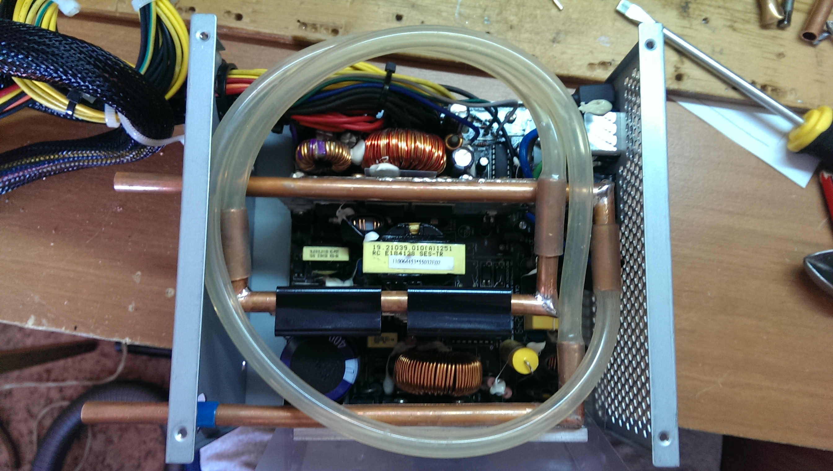 Это мой водоблок одного из жестких дисков. Он из меди, подчеркну это И что же мы видим? О боже, это же коррозия! Торец трубки съеден и видна большая сквозная раковина! Как так? Оказалось, что следом после енго по контуру идет водоблок блока питания. И на одном из радиаторов неожиданно появилось напряжение, смертельное, постоянка с диодного моста, 300В. А так как я применил антифриз, его электропроводность, вероятно, выше, что и вызвало электрохимическую коррозию, причем примерно за пару месяцев. К слову, БП выглядит вот так: