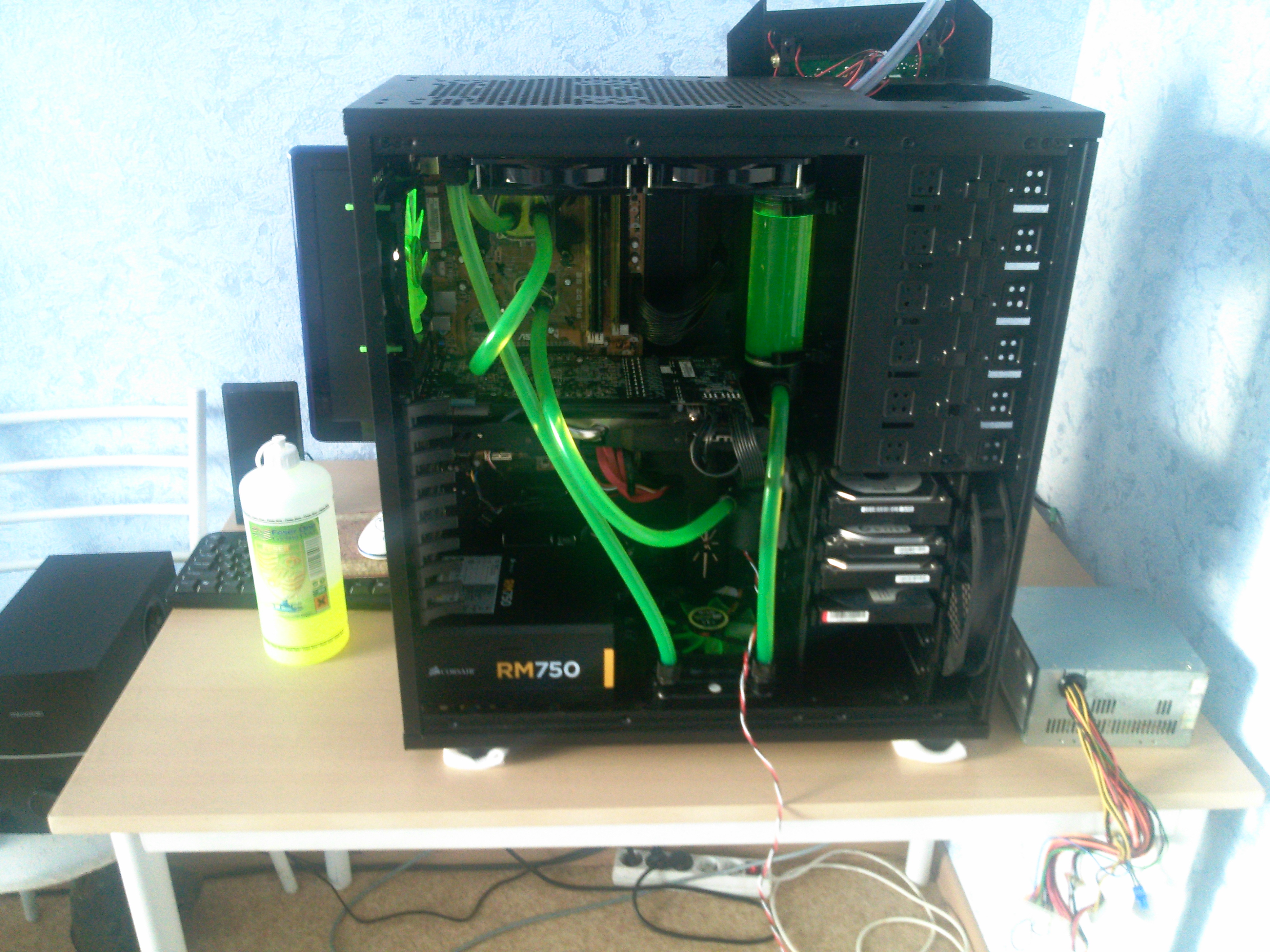 Водоблок будет по-любому. Скорее всего опять китайский А вот по поводу радиатора - раньше он у меня был один, висел на задней стенке, добавил двухсекционник и они не стали умещаться друг с другом, поэтому я его вниз направил. А там у меня тупо шланга не хватило. Но после последней сборки я его добавил в контур. Вот что вышло: