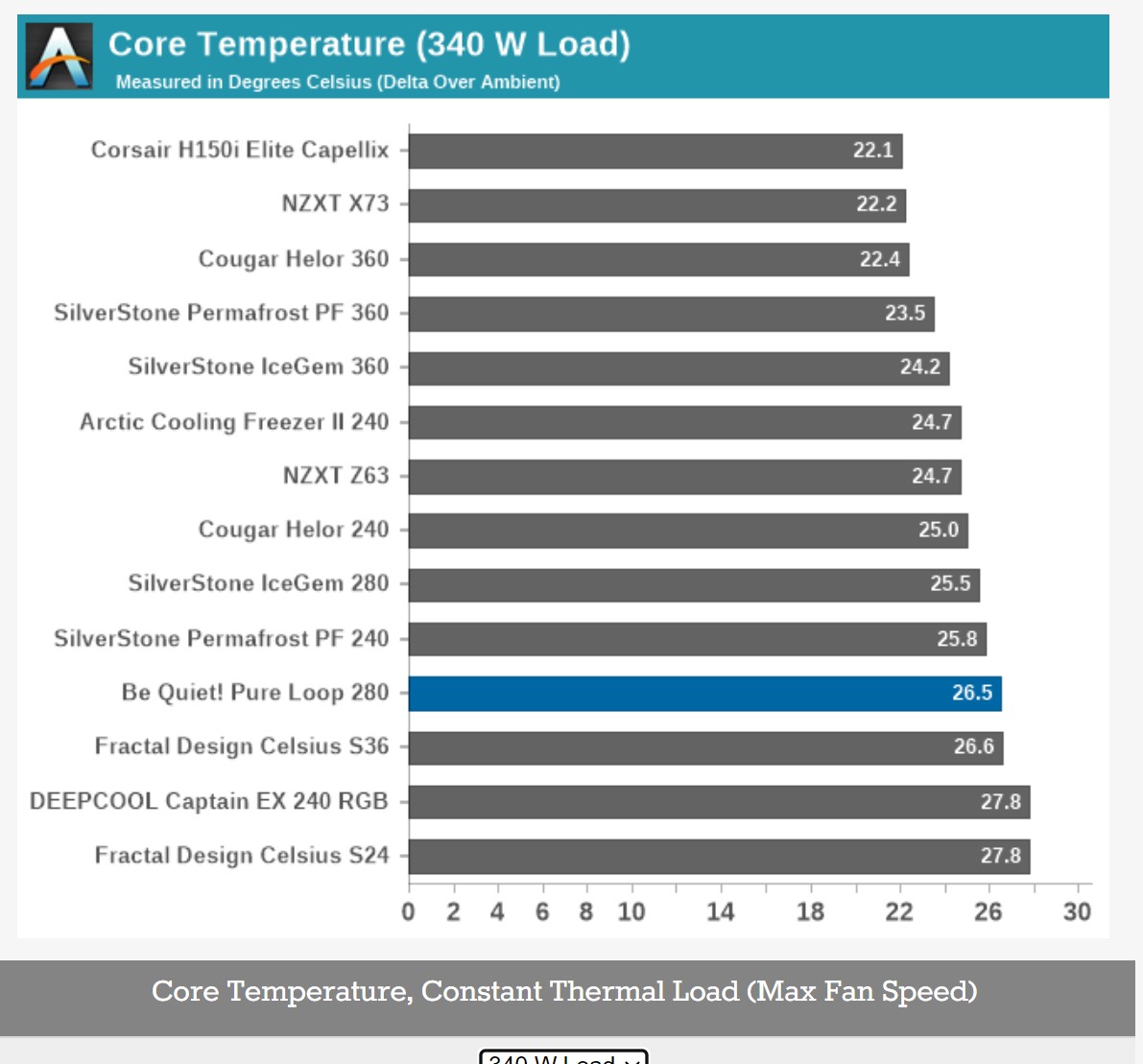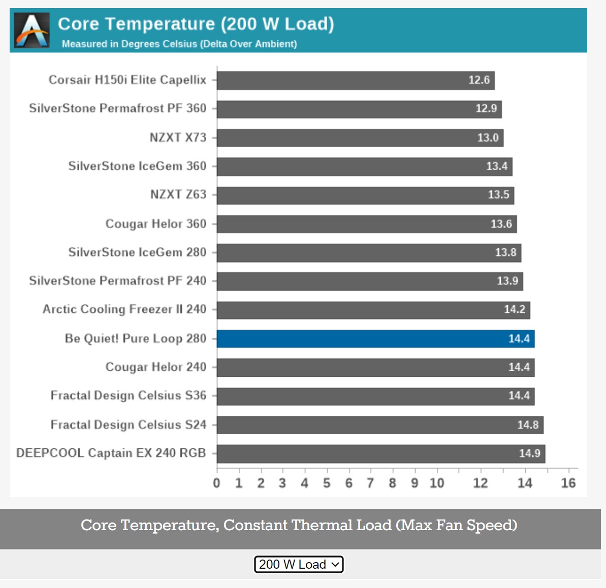 Как видно, с ростом тепловыделения разница между 240 и 280 радиаторами стремится к нулю, тогда как разница между 240 и 360 остается заметной.