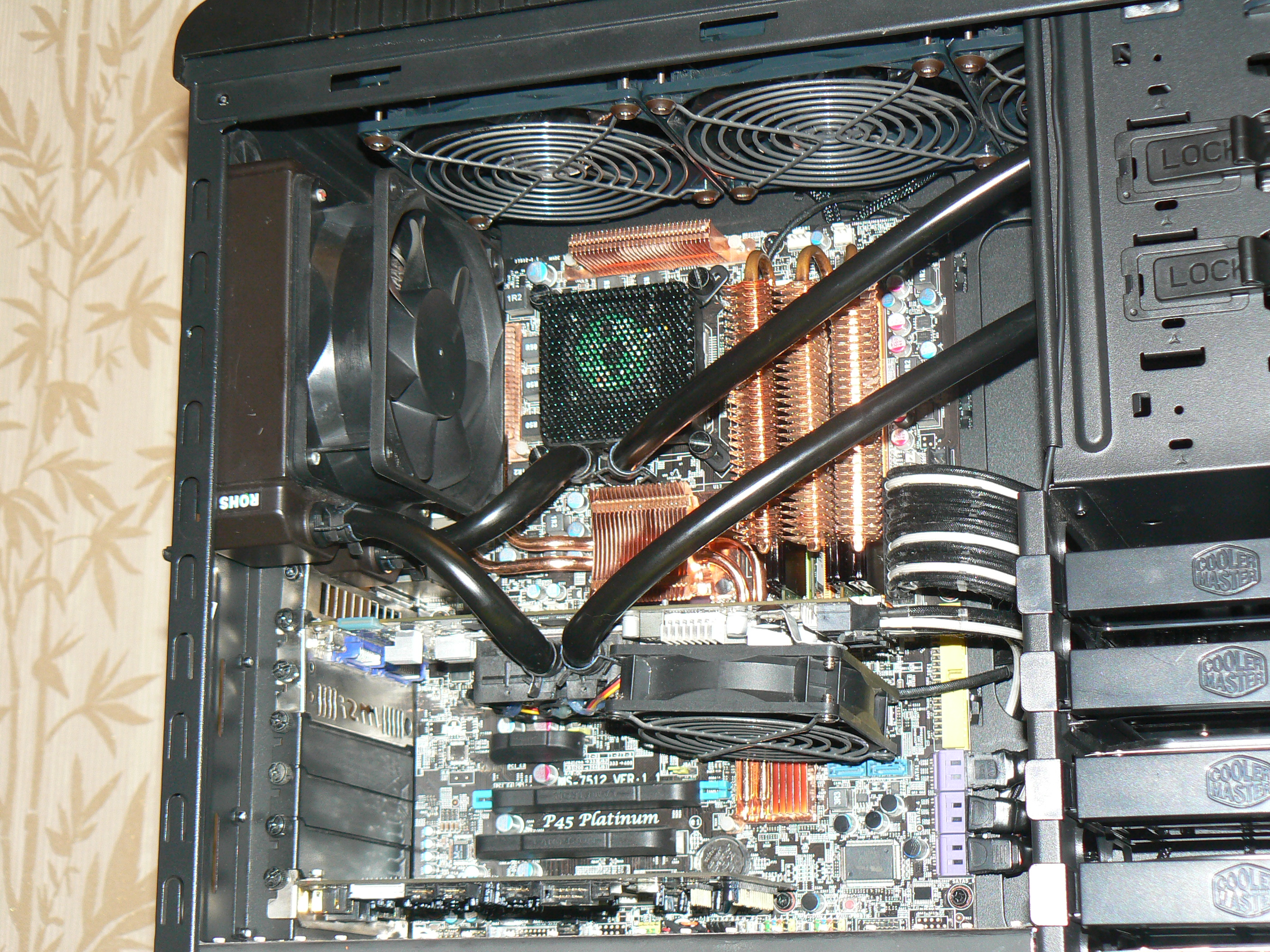Здравствуйте! Закончил сборку СВО на основе Н-80 и Н-100: - помпы/водоблоки от Н-80 и Н-100; - шланг 10/13мм; - резервуар xspc; - в системе заменены радиаторы на медные 1х120 и 3х120; - над врм видеокарты стоит вентилятор 92мм; - порезан корпус, сверху для установки радиатора 3х120 и сзади для установки радиатора 1х120 фитингами вниз; - с помп/водоблоков сняты верхние крышки с контроллерами вентиляторов. водоблоки закрыты сеткой (от гриля динамиков поменьше 15 гдш...). Разница в темпаратурах от замены прадиаторов минимальная - нехватает производительности помп скорее всего (осталось сделать помпу из движка жесткого диска). Температура под фильмами/музыкой/интернетом: видеокарта - 32градуса, процессор - 43градуса. Под играми в которые играю изредка температура процессора выше 70 ниразу не поднималась, а видео выше 50...