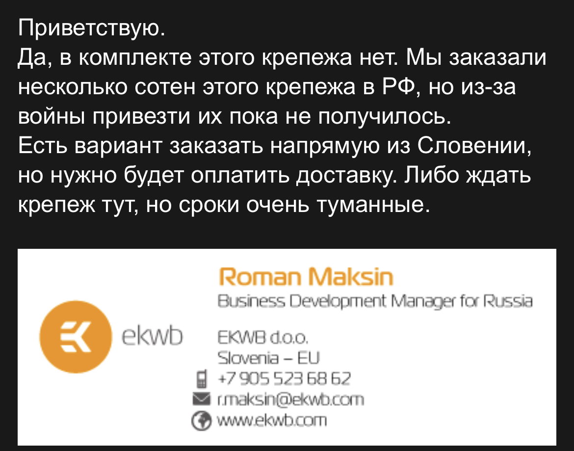 Привет, спасибо за старания картинки и мозгование системы! Вобще ребят всем спасибо, что не остались равнодушными. Заказала себе воду EK в итоге, какие то проблемы с доставкой. Описали так что не хуже д15. Единственное нужно будет приколхозить эту воду к системе, потому что креплений нет. Написала в поддержку типу, если получится скрин приложу. В любом случае что то нужно будет придумать, насколько я понимаю мне правильную высоту шайбы нужно подобрать. Если вдруг у кого нибудь есть крепление lga 1700 на такую воду, буду признательна если расскажете про высоту стойки.