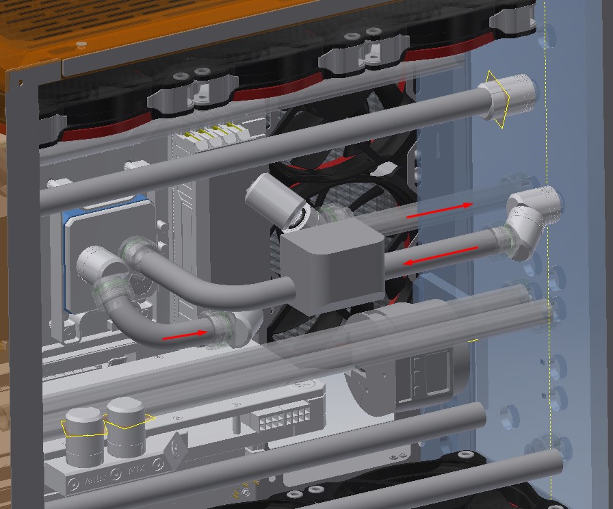После предварительной сборки решил немного все поменять. Для более быстрого обвоздушивания системы, слива жидкости и возможно увеличения расхода, боковой радиатор перемещу вниз. Сбоку будет нагнетаться свежий воздух двумя 120-ми, освободившееся место от третьей боковой 120-ки необходимо для доступа к сливному крану, ведь теперь для доступа в нему мешают линии с нижнего радиатора. Видеокарта горизонтально вместо вертикального расположения. Расход наверное будет лучше (сравнить пока нет возможности, расходомера при первом варианте еще не было), как и упростится немного слив. Есть возможность подвести сво для оперативки. Очищать от пыли нижний радиатор будет сложнее, но уже нашел на али крепление вентиляторов на рамке. Вентиляторы закреплю на рамке, а саму рамку на 2-4 винта к радиатору. При необходимости уплотню места прилегания рамки тонкой 2-3 мм самоклеющейся лентой. При очистки от пыли рамку снимаю с вентиляторами и открывается легкий доступ к нижнему радиатору. https://ibb.co/r5S4z4L
