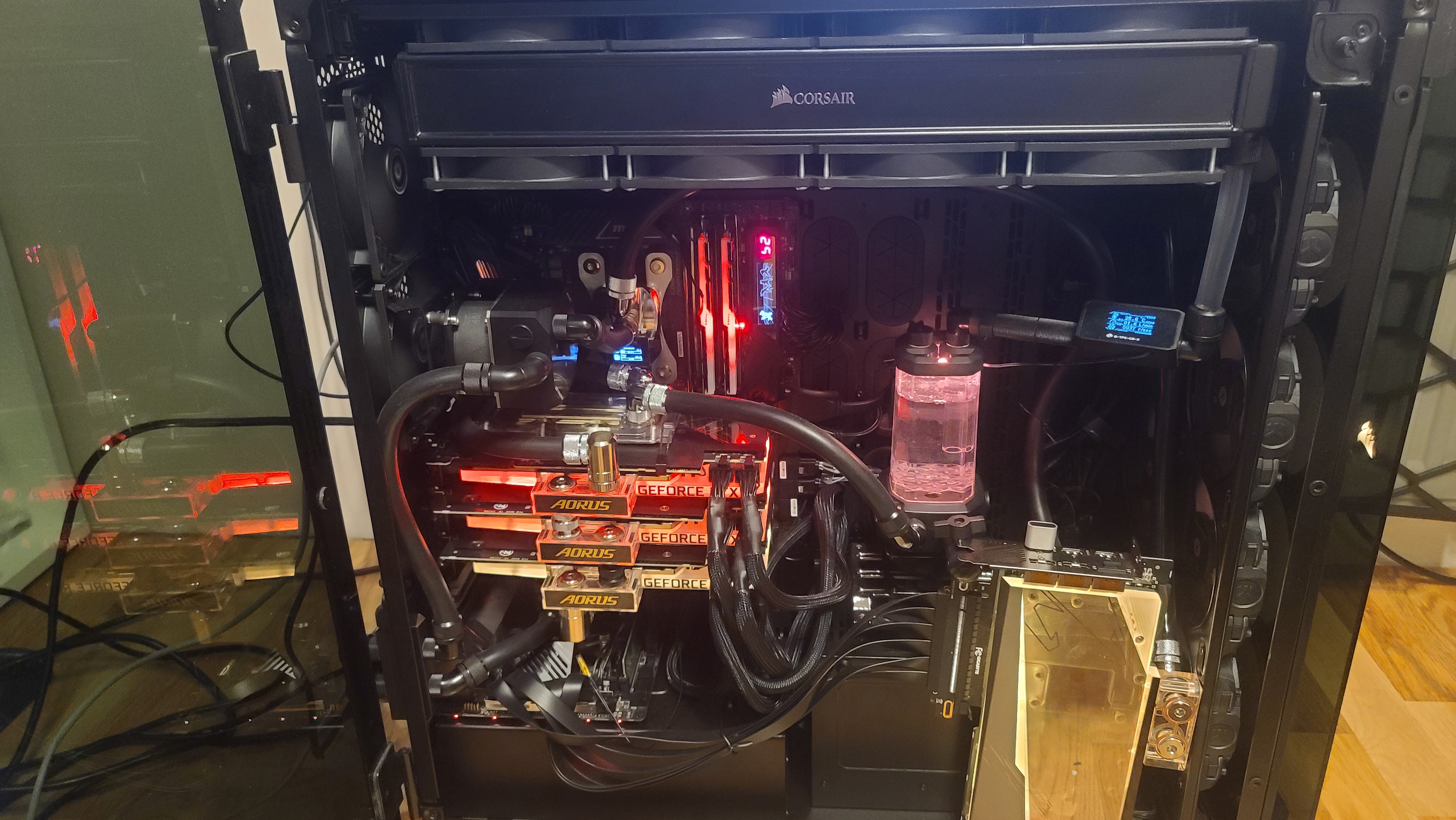 Можно конечно установить дуалтоп над резервуаром, но я ещё не решил. Перенесу ли я Mini-ITX из левого нижнего угла на место резервуара на фото или оставлю там, но установлю 2 видеокарты на это место вертикально, тогда дуалтоп будет мешать. Дело в том, что в левом нижнем углу температура воздуха доходит до 40°,а это забыть о разгоне памяти и следить за горячим чипсетом. Да и бп не поменять без геммороя.