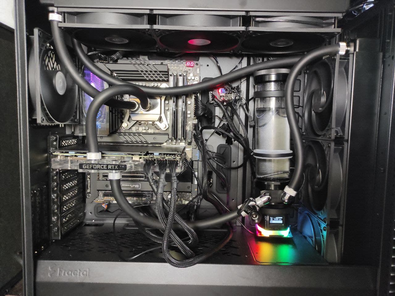 Всем спасибо в этом разделе . Переехал я с DDR-3 сразу на DDR-5, собрав свою первую воду . Кабельменеджмент страдает и рез криво стоит, но ещё есть над чем работать Набор такой: два 420 радиатора альфакул комборез ULTITUBE D5 PRO водоблок процессора - хиткиллер4 водоблок видеокарты альфакул для геймрока шланг ZMT фитинги barrow 16/10 вентили Arctic 14PWM жидкость EK Cryofuel ~1,5 литра хаб для вентиляторов - splitty9 active 12900к и GameRock 3080ti пока ещё всё в стоке Корпус Fractal design define XL Карта везде упирается в лимит 390-400w и память не едет на XMP 5600, поехала только после обновления биоса и только на 5400 после увеличения напряжения где было 1,2 на 1,25. Ветку с памятью читаю, эксель от Анты смотрел - ничего не понял пока Пока вопрос насущный: какой биос прошить на карту?