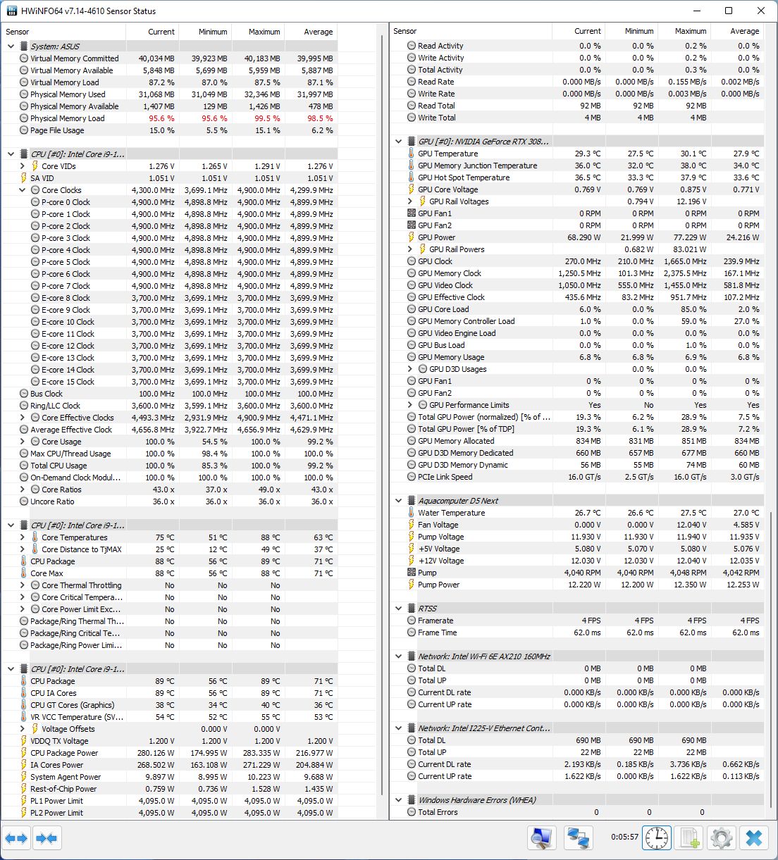 Пока ничего не разгонял и тяжёлым не нагружал, немного Prime95 только на попробовать - 92 градуса при 280 Ватт при воде 30, а в игрушках и проц и видео 50+ градусов.