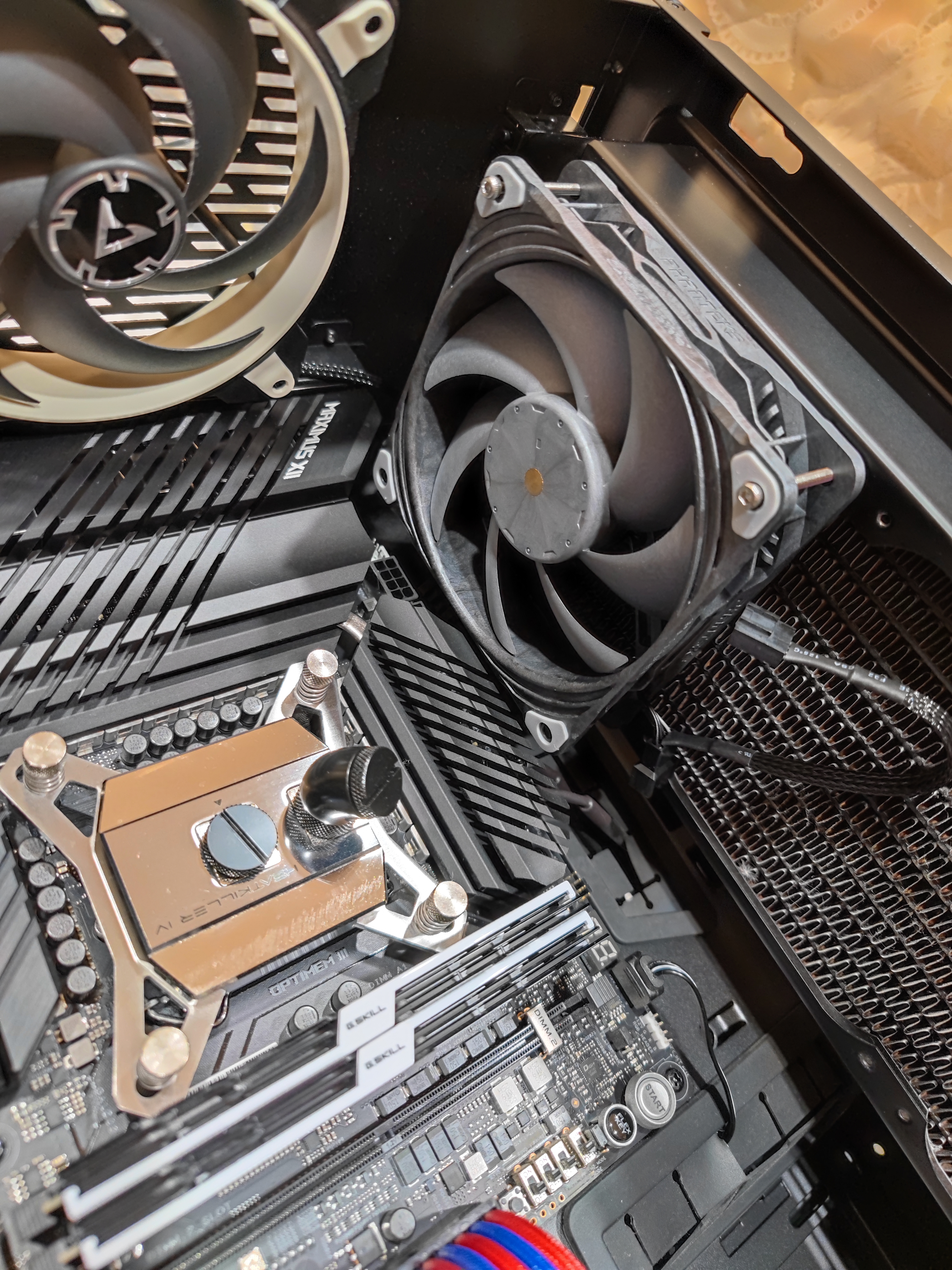 Так как ко мне наконец-то приехало всё, после немного задушенной жабы, пару вопросов. Напоминание о системе: Вода охлаждает только 3900 в даунвольте, без видокарты, т.е. TDP где-то 110, может будет много больше, по реальным ваттам из розетки в копании монеро на получается где-то 150 ватт. 1) Будет ставиться тонкий радиатор 280 мм. Дополнять ли его также имеющимся умеренно толстым 120 мм, или 280 мм и так с головой хватит для тихой системы? 2) Помпа VPP755 v3. Наверно, по эффективности снятия тепла её хватит на любой скорости, так что я хотел бы ориентироваться на максимальный срок работы. Т.к. там вроде вращение ротора вокруг оси, а нее в "левитации" как на обычной, ставить на минимум? 3) Но совсем водяной, но тоже вопрос. Корпус у меня FD Meshfi C. Крышка для больших радиаторов на кожухе закрыта. В корзине кроме маленьких дисков поставил 3,5 винчестер. Он греется до 38-41. Это много мало? Жертвовать эстетикой ради охлада?