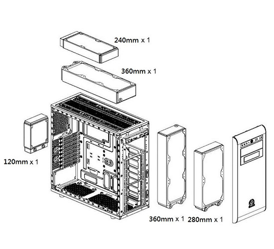 Iceforest Я собираю в nzxt h440, правда у меня be quiet silent loop 280, но туда 360 спокойно лезит, можно поставить спереди, можно сверху (я сверху поставил)