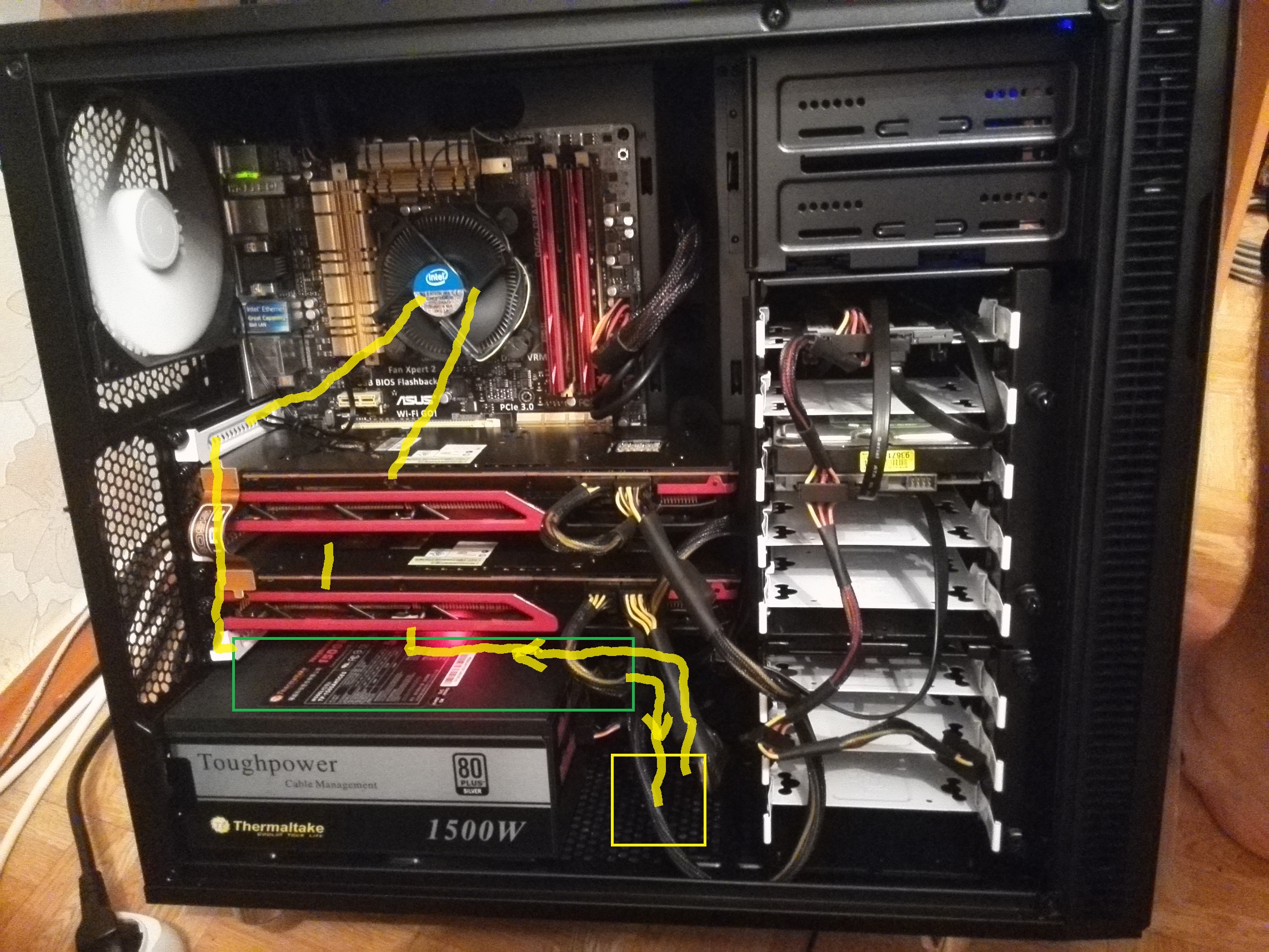 Farmazon Да, корпус глупый. Но если у тебя колба ляжет то и встать она должна! Провода к видеокартам через низ протяни вдоль мат платы и подогни. Колба должна будет встать в рост, они не такие и толстые. Можешь и положить конечно, разницы мало будет.
