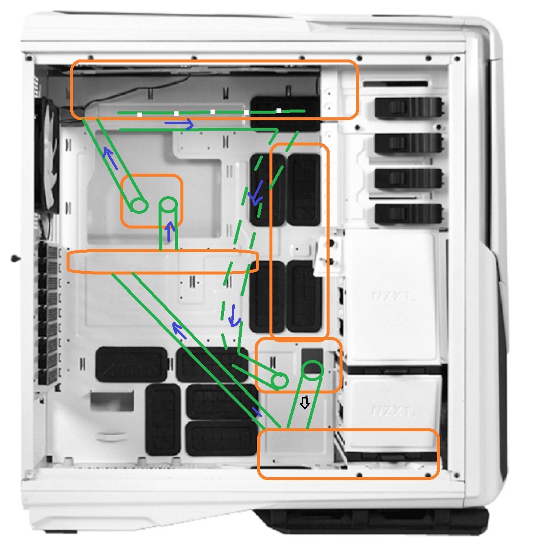 Камрады, появилась мыслишка как проложить возвратный шланг от верхнего радика к помпе с резом, не за задней стенкой, а внутри корпуса. На рисунке красным показана трубка EK-HD Tube 12/16mm 500mm (2 pcs), к нему EK-HDC Fitting 16mm G1/4 - Black Nickel 2шт, и два уголка на 90*, что-бы он не провисал под ним будет что-то вроде уголка - это прямой участок, а вниз к помпе с резом, будет уходить гибкий шланг. Как думаете жизнеспособная идея.