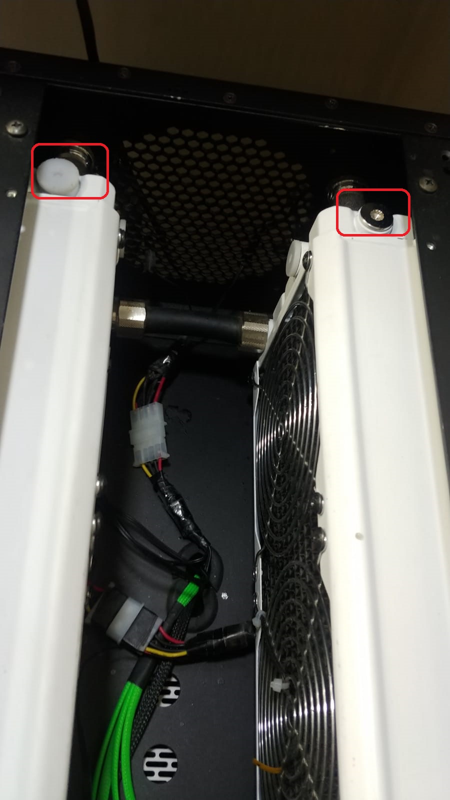 У меня оба контура имеют заправочные фил порты в верхней части корпуса + ещё 2 точки на верхнем радиаторе где можно открутить пробочку при необходимости. На заправку я собираю из соеденителей папа-пап крана и мелкого фильтра заправочную линию и накручиваю на заправочный фил порт, сверху старый резервуар, в него залив, на 2х помпах, можно залить сколько зальётся и стартовать, доливая по мере ухода воздуха. Контур ЦП прочухивается минут за 10, а не за пару суток как на кривых конфигах. Когда помпа была 1 на контур ещё скручивал пробочку из верхнего радиатора и накручивал туда башню из прозрачной трубки с пробкой, через это стравливал воздух и легко было контролировать потенциальный перелив, на 2х помпах уже нет нужды и так продавливает.