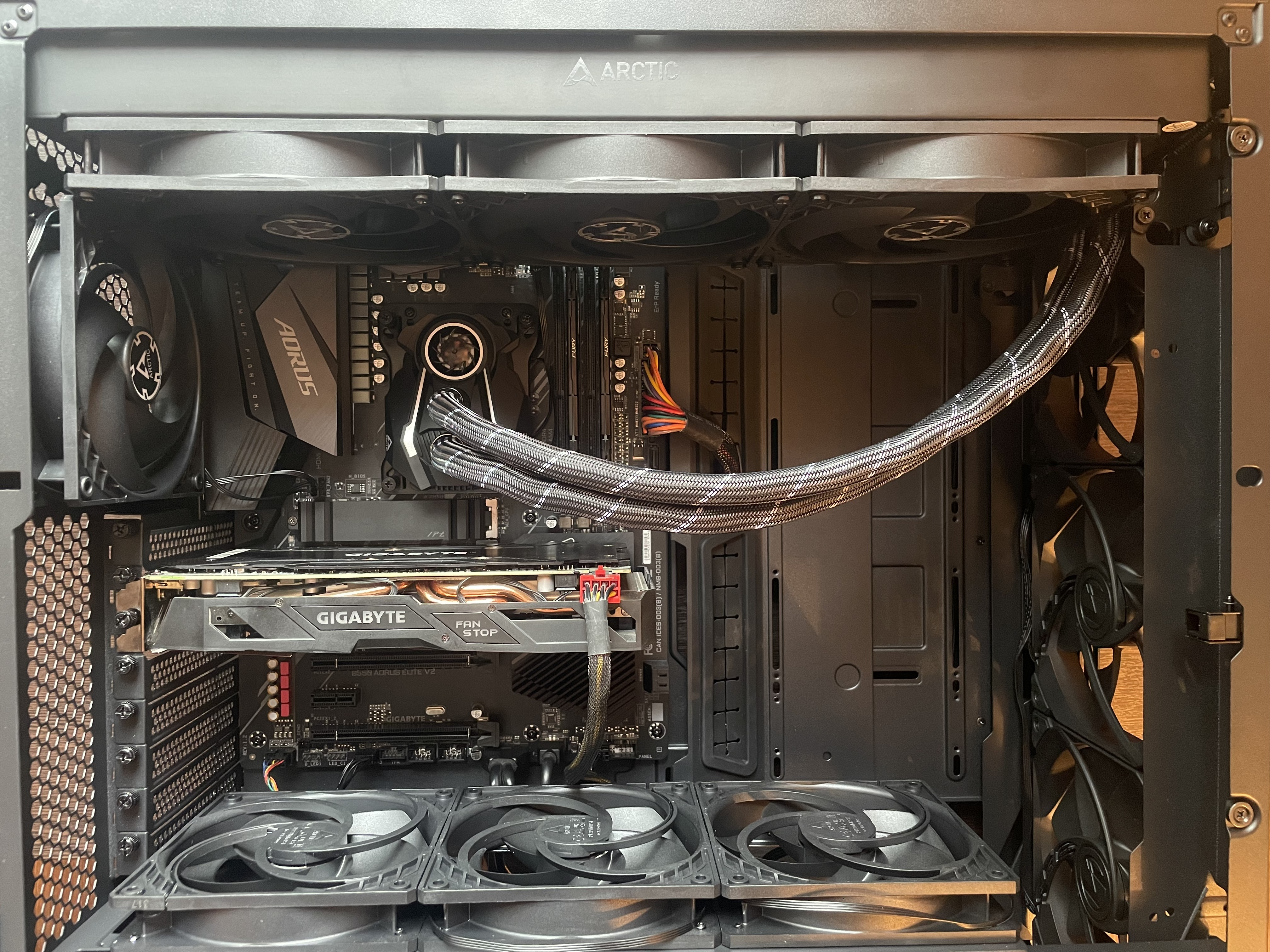 Корпус Lian Li LanCool 3 + Arctic Liquid Freezer II 420. Есть 2 варианта установки заднего вентилятора на выдув, 120 мм внутри корпуса или 140 мм снаружи.