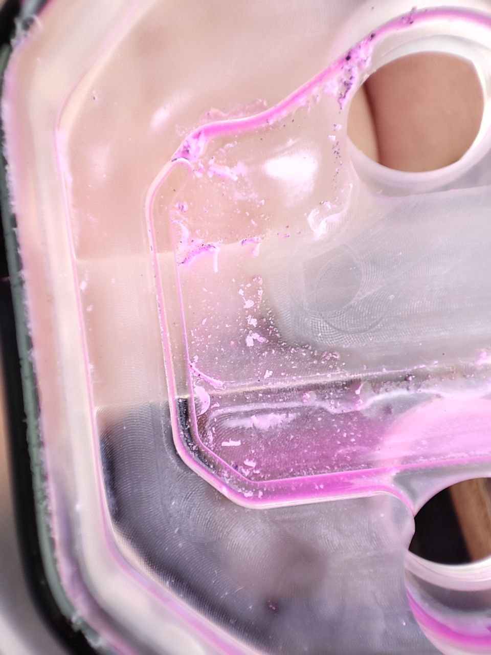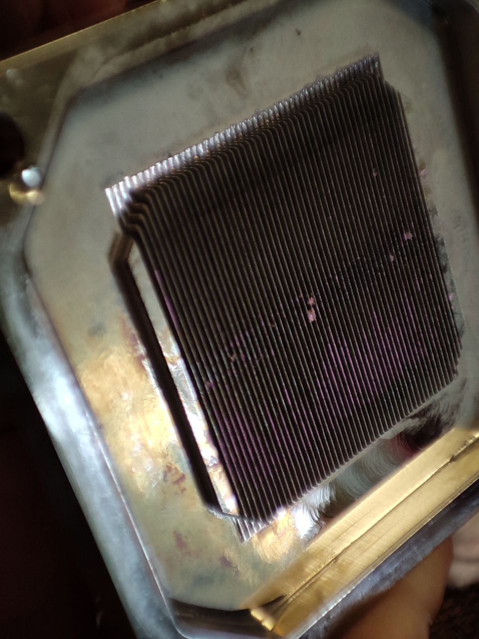 Кстати насчёт водоблока на CPU Barrow LTSEA-04N RBW и жидкости EK-CryoFuel Solid Electric Purple (Conc. 250mL) разбавленной по инструкции дистиллятом в ближайшем автомаге, прикладываю фотки ВБ спустя 5 месяцев )) Повторюсь, был "неначитавшимся", поэтому хрен пойми, какой дистиллят был, радиаторы никто не думал промывать перед установкой, жижа сливалась и заливалась при смене процессора, не фильтровалась и не проверялась на предмет мусора хлопьев и пластификата ( хотя у меня petg) По ВБ кстати претензий нету, легко разбирается и собирается, никель не слез, каналы с очистил без особого фанатизма и труда. а вот по температурам смогу сказать после сборки ( термопаста была старая изначально, и заливать я буду уже не постельную скорее всего. ну если только отфильтровать получится с умом, для эксперимента хочу)