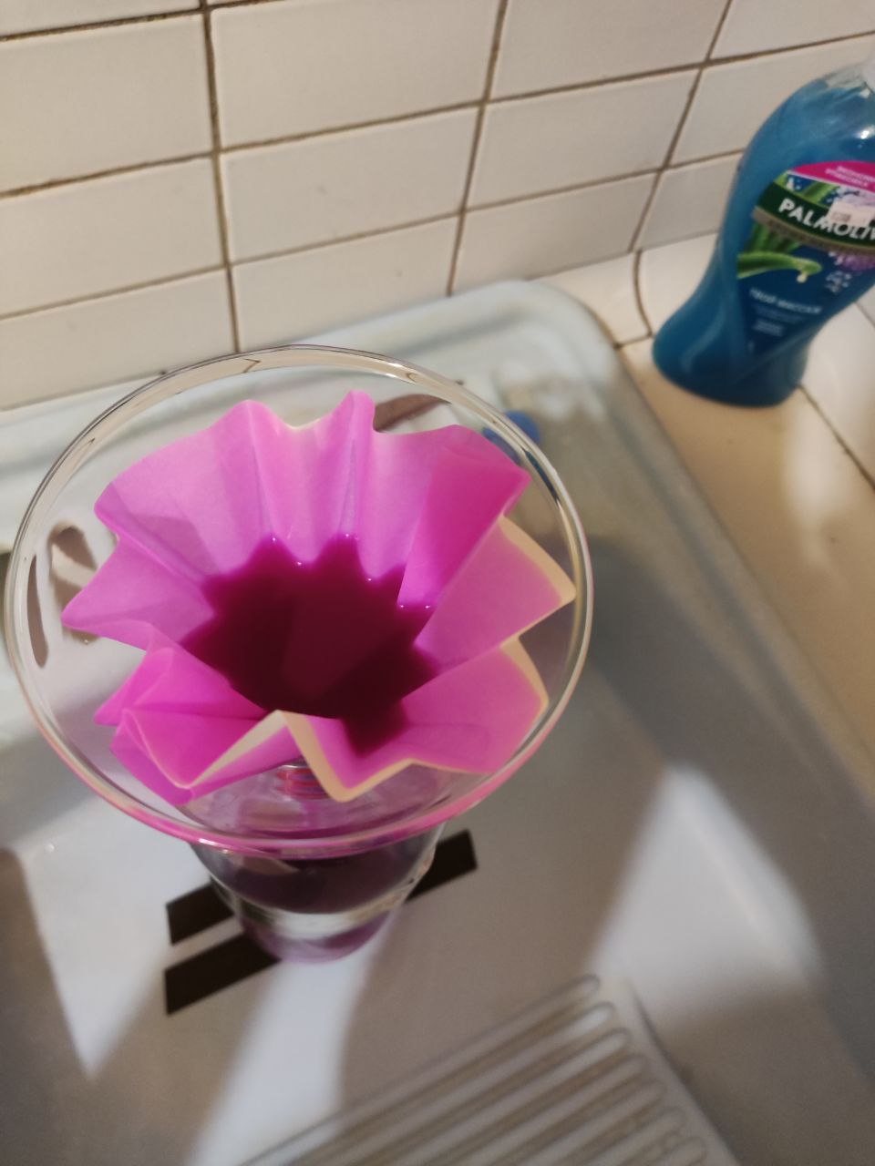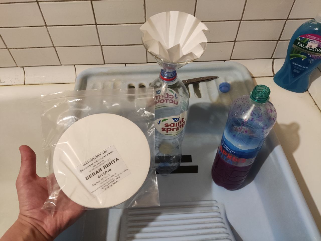 Добавлено спустя 26 минут 15 секунд: Решил ту самую жидкость от ek отфильтровать обеззоленным фильтром ( пока что белой лентой, на синюю времени я думаю не хватит, слишком плотная. да и мне кажется цвет полностью уйдет) Вот в прямом эфире пишу. ток начал. если кому интересно, могу попытаться показать результат ( осадки на фильтре , больше не знаю , как показать). Цвет жидкость вроде особо не меняет. может чуть менее насыщенная становится. совсем слегка. P.s. обе бутылки предварительно промыты из-под крана, потом промыты деозонированной водой. кроме минералки там ничего не было.