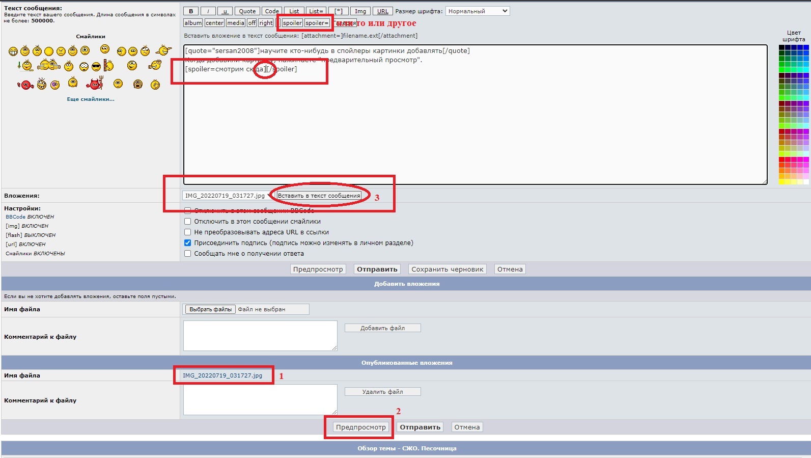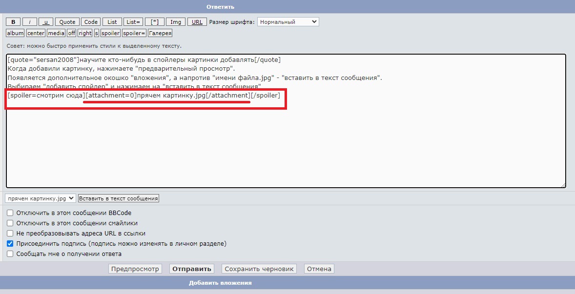 Когда добавили картинку, нажимаете "предварительный просмотр". Появляется дополнительное окошко "вложения", а напротив "имени файла.jpg" - "вставить в текст сообщения". Выбираем "добавить спойлер" и нажимаем на "вставить в текст сообщения"