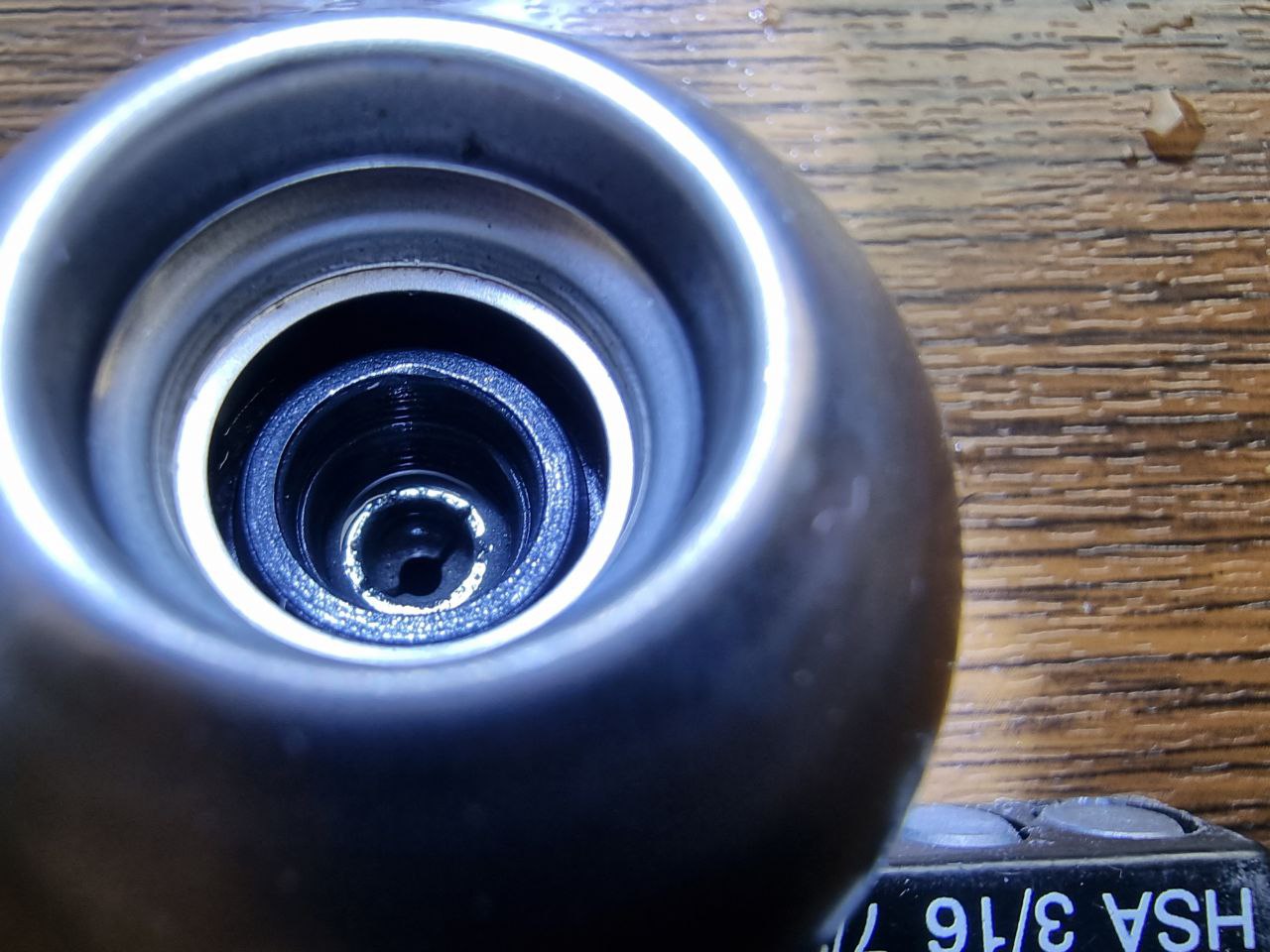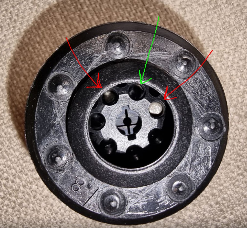 Нет, через одно отверстие. Сейчас рассмотрел внимательно под лупой. Туда засунули нечто похожее на металлический шарик. Промерил штырьком глубину отверстий, только в двух отверстиях что то есть, причём в одном на дне, во втором ближе к верху. Попытался надавить на это нечто, что ближе к верху отверстия, вниз не проталкивается. В остальных отверстиях на стенках какой то коричневый налёт, как будто чем то мазали, возможно клей, но это только предположение. Красными стрелками указал отверстие с заполнением, зелёной указал на место, где виден налёт на стенке отверстия. Такой налёт есть во всех пустых ячейках.