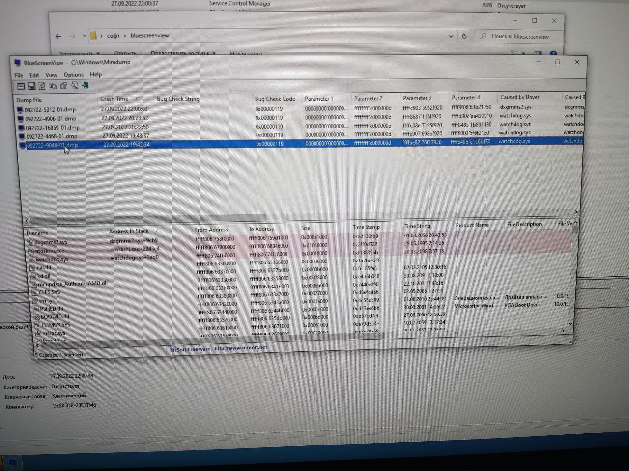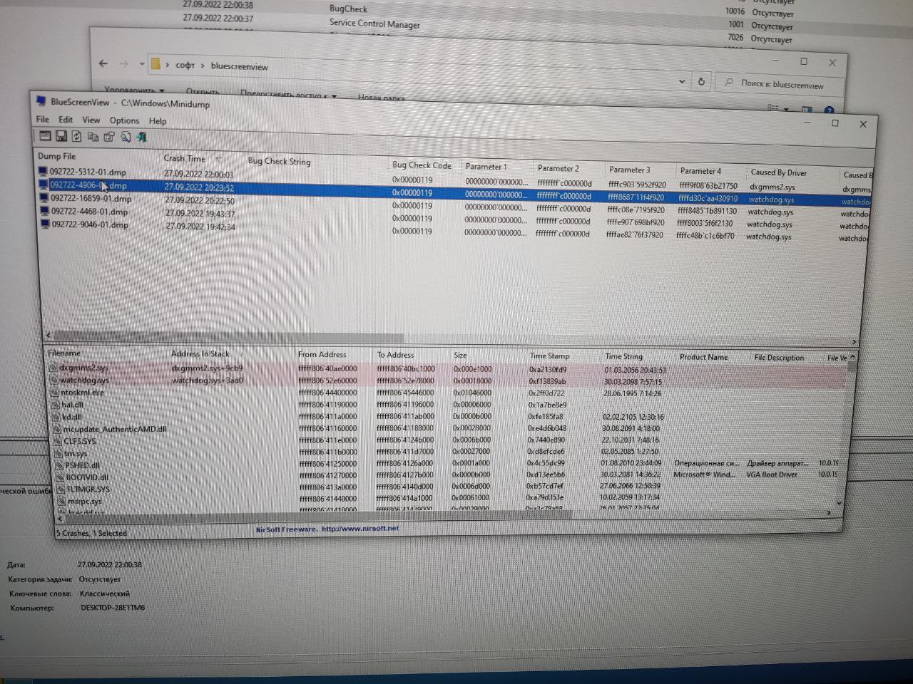 нет, dwm.exe нету. либо просто в журнале событий предупреждение "display". ну мол TRD не успел отработать и просто перезапустился драйвер. Либо ошибка всеми известная nvlddmkm.sys с морганием экрана уже с кодом ошибки 0 или 14 ( я бы скрины скинул , но я на работе). Очень редко система вообще уходит в ребут, причем раньше , до ремонта ( а он там ничего не ремонтировал по сути) , система с bsod с разными ошибками уходила. Теперь просто хардребут , но в журнале событий есть ошибка BugCheck ( то есть дамп таки сохранён и bluecreenviewerОМ читается )