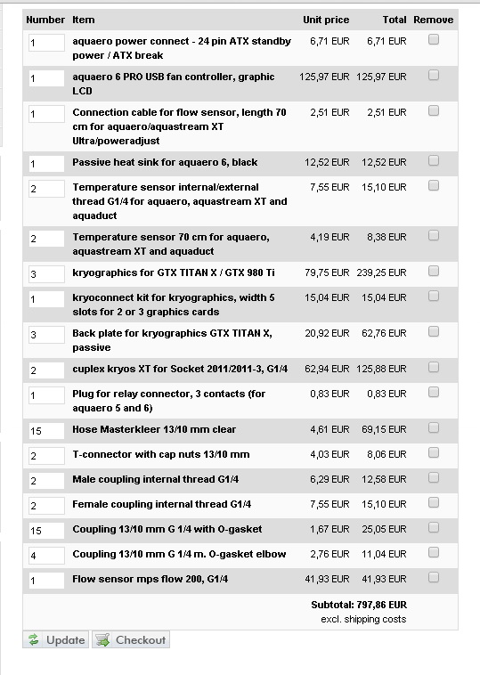 Помпа: Laing DDC 1T - 1 шт. или Laing D5 Vario, Топ для помпы: EK-DDC X-TOP V2 - Acetal G1/4 - 1 шт. или EK-D5 X-TOP - Acetal G1/4 Rev.2, Водоблок на проц: EK Supreme HF - 1 шт., Водоблок на видео: спросить в соответсвующей ветке, лучше fullcover, Радиатор: Coolgate Copper Radiator Triple120/60mm - 1 шт., Вентиляторы: Scythe Gentle Typhoon - 3 шт., Шланг: Primochill Pro LRT диаметром ID 10mm, OD 16mm - 3 метра (они же 10 футов), Соединения: фитинги Bitspower/EK/Koolance ID 10mm, OD 16mm - 8 шт., Жидкость: готовая жидкость от ЕК/Thermochill.