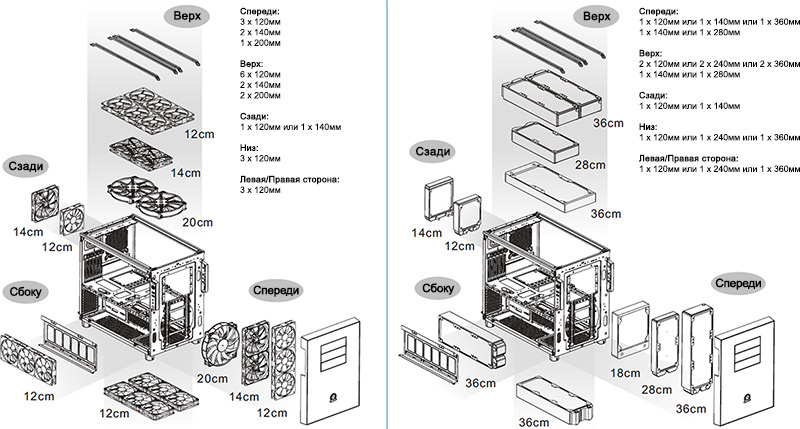 Больше все таки к x9 склоняюсь , простора много , все же хочу поставить внутри радиаторы , на верхнюю панель 2 радиатора , на них вентели на вывуд , а на передней и боковой панели вентили на вдув поставить , корзину снять для 5,25 и туда тоже вертушку поставить, корпус весь "дырявый" свежего воздуха должно хватать и фильтры противопыльные вроде везде присутствуют Нашел картинку с возможными местами расположения радиаторов