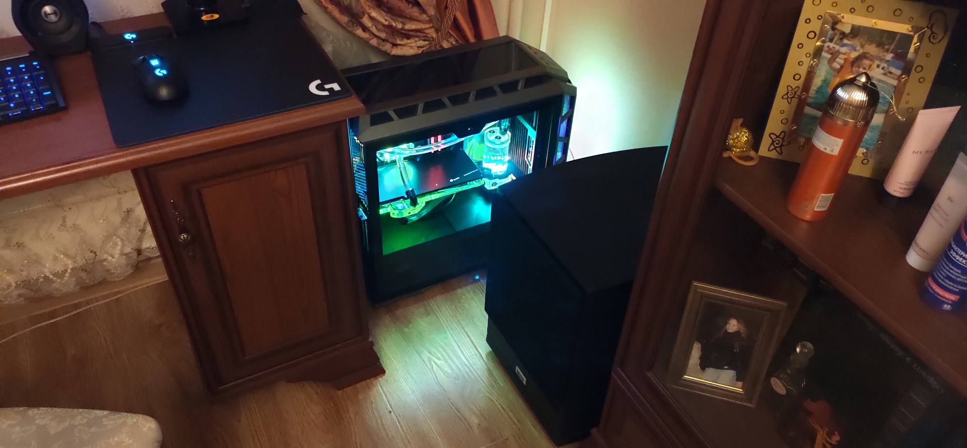 А насчет внешнего радиатора, нет у меня под него место вот вам фото расположения пк, куда тут внешку ставить или мору??? Вот по этому приходится выкручиваться в тех лимитах что есть с водой внутри.