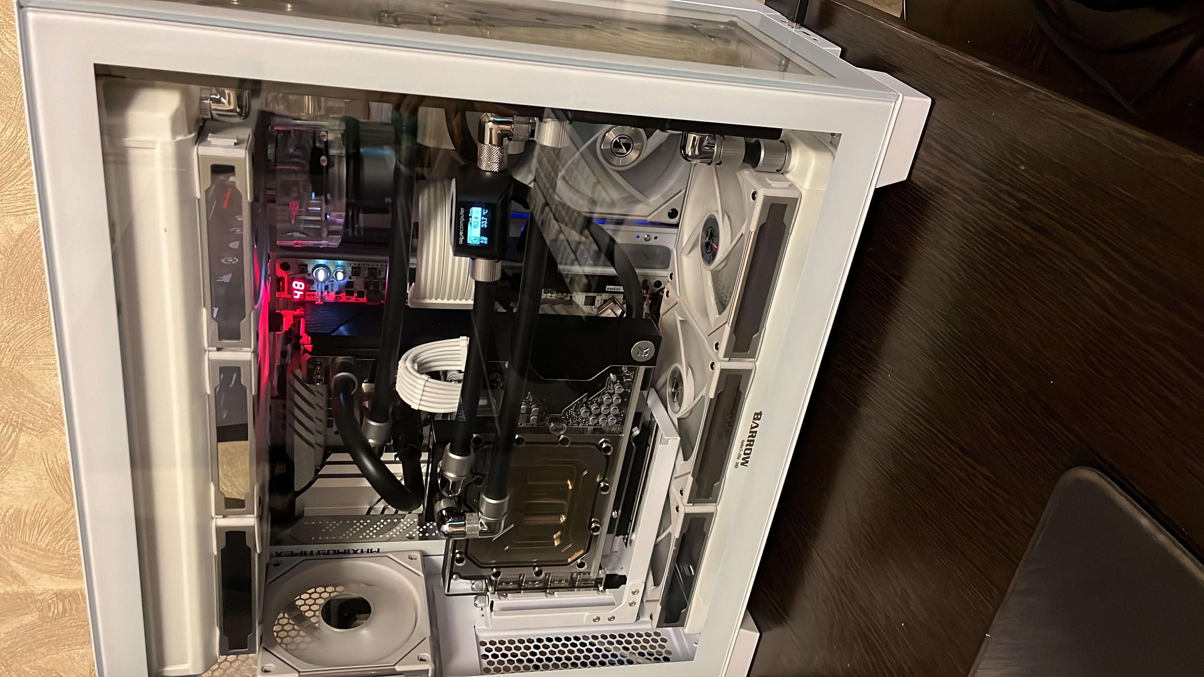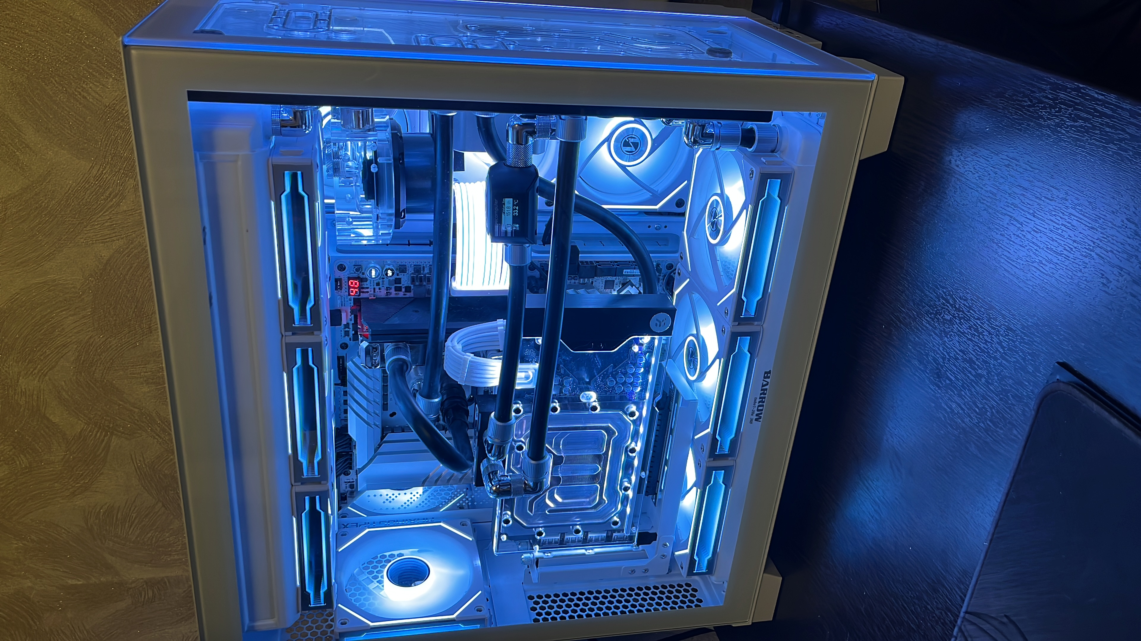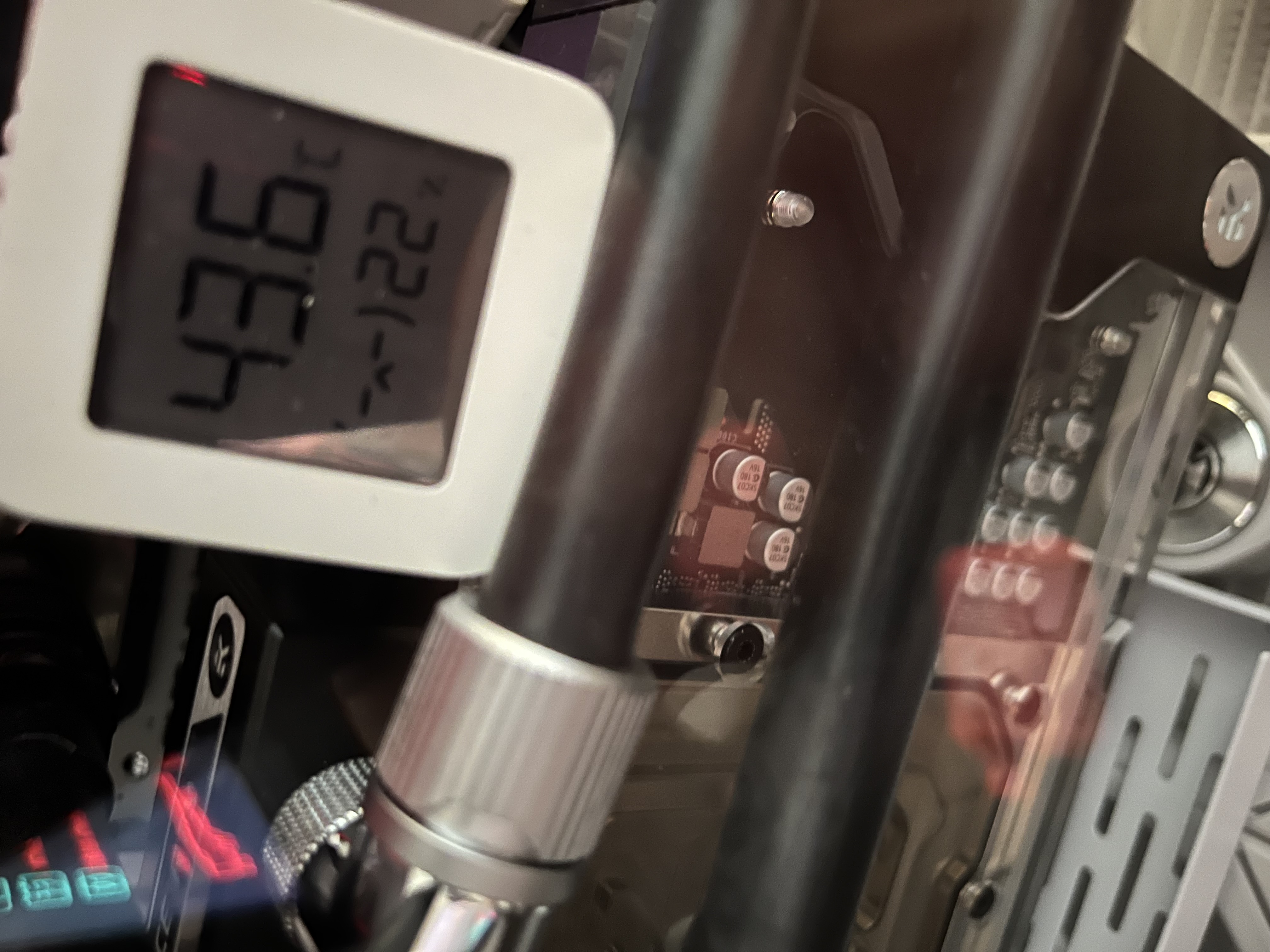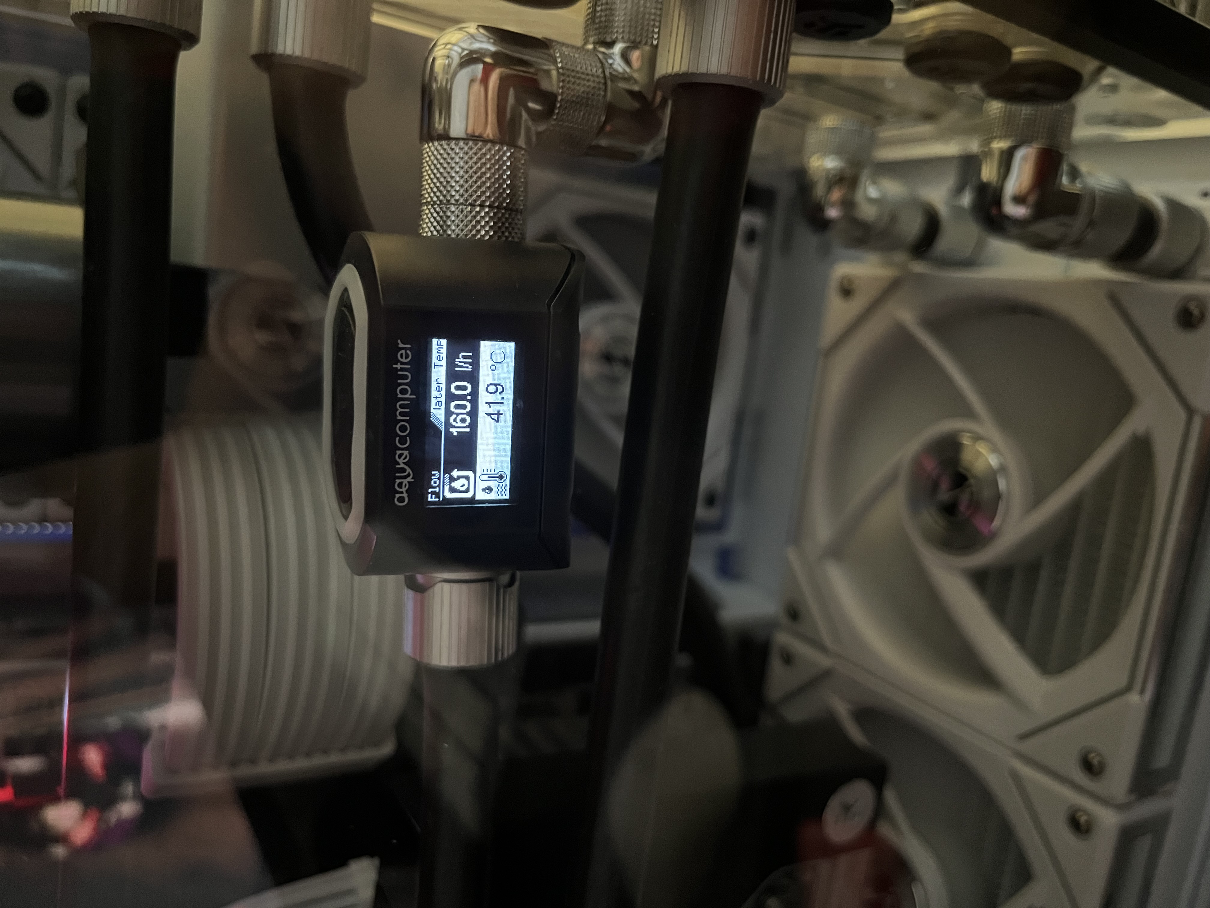 Всем доброго времени суток. Ну вот и я полез в кастом воду. Не зная броду, как водится. Поэтому судите строго, как есть, но конструктивно и по существу. Буду рад любой адекватной критике. Итак, к делу. Система собрана в корпусе Lian li dynamic evo. Рез: дистра EK-Quantum Reflection² PC-O11D EVO D5 PWM D-RGB - Plexi. Вторая помпа alphacool VPP 755 v3 plexi. Радики: black ice nemesis gtx 360 (верхний), black ice nemesis gts 360 (боковой) и Barrow 360 20mm толщина (нижний). Водоблоки: CPU - iceman direct die, GPU - EK-Quantum Vector² FE RTX 4090 D-RGB - Nickel + Plexi, RAM - радиаторы и водоблок от iceman. Фитинги ЕК, барроу, букски, бысросцепы куланс кд3, в общем солянка. Шланги хиткиллер 10/13. Обдувается это все дело вертушками от Lian li unifan sl-infinity 120. Теперь по направлениям потока жижи и воздуха. Вода: дистра-нижний радик-дистра-видяха-дистра-оперативка-проц-дистра-верхний радик-боковой радик-вторая помпа-дистра. Воздух: нижний радик пулл снизу наверх (внутрь корпуса), боковой радик пулл внутрь корпуса по аналогии с нижним, верхний радик пуш наверх (выдувает из корпуса), ну и задняя вертушка выгоняет горячий воздух из корпуса назад. Датчик потока aquacomputer flow next установлен после всех радиаторов, то есть показывает темпы воды после того, как тепло было отведено через них. Теперь к возможным проблемам: при игровой сессии в несколько часов, то есть когда контур прогревается и выходит на максимальные температуры получаю следующую картину: воздух снаружи 29С (при старте ПК было 27.8С), воздух внутри 43.6С, жижа 41.9С (жижа mayhem’s eco clear premix, ~1.4L), проц ~67С avg (потребление ~150вт в среднем, LLC7 die sence, 1.35vcore, 5.8-4.6-5.0 P-E-Ring), видяха ~60С, сток, потребление ~350ВТ в среднем (стоит в райзере), оперативка 44.5С. Поток 160л/ч, вертушки фикс 1250 об/мин (это максимально допустимый для меня уровень шума в ~35дб) Вопрос: можно ли добиться более эффективного отведения тепла в данном контуре? К примеру разогнав поток до 300-600 л/ч? (поставив третью помпу например). Или изменив схему расположения компонентов к примеру. Или добавив еще один маленький радиатор 120мм на заднюю вертушку? Или поставив на бок 45мм радик и на низ 45мм, убрав при этом видяху из райзера? Все варианты расположения вентиляторов на вдув/выдув/задув/продув уже проверены и выбрана лучшая конфигурация, описанная выше. Вариант с заменой вентиляторов не предлагать))) элемент красоты в них есть, менять ни на что другое не намерен. Или забить болт и оставить как есть и наслаждаться? И главное: зачем я вообще все это написал? Что я получу, увеличив эффективность контура, снизив температуры. А ничего. Просто хочу. Просто надо))) посему попрошу всех желающих высказаться, и возможно помочь. Всем небезразличным огромная благодарность.
