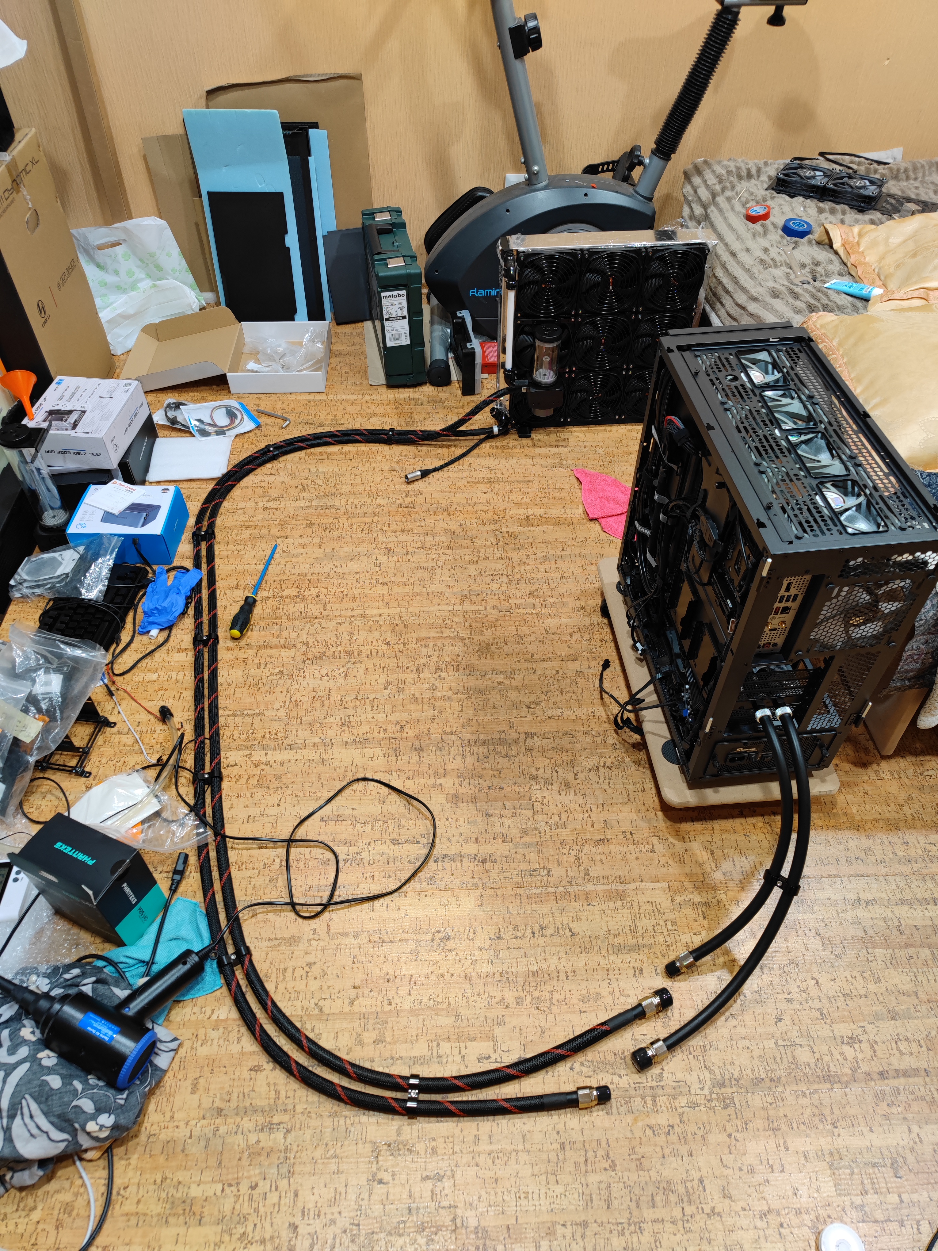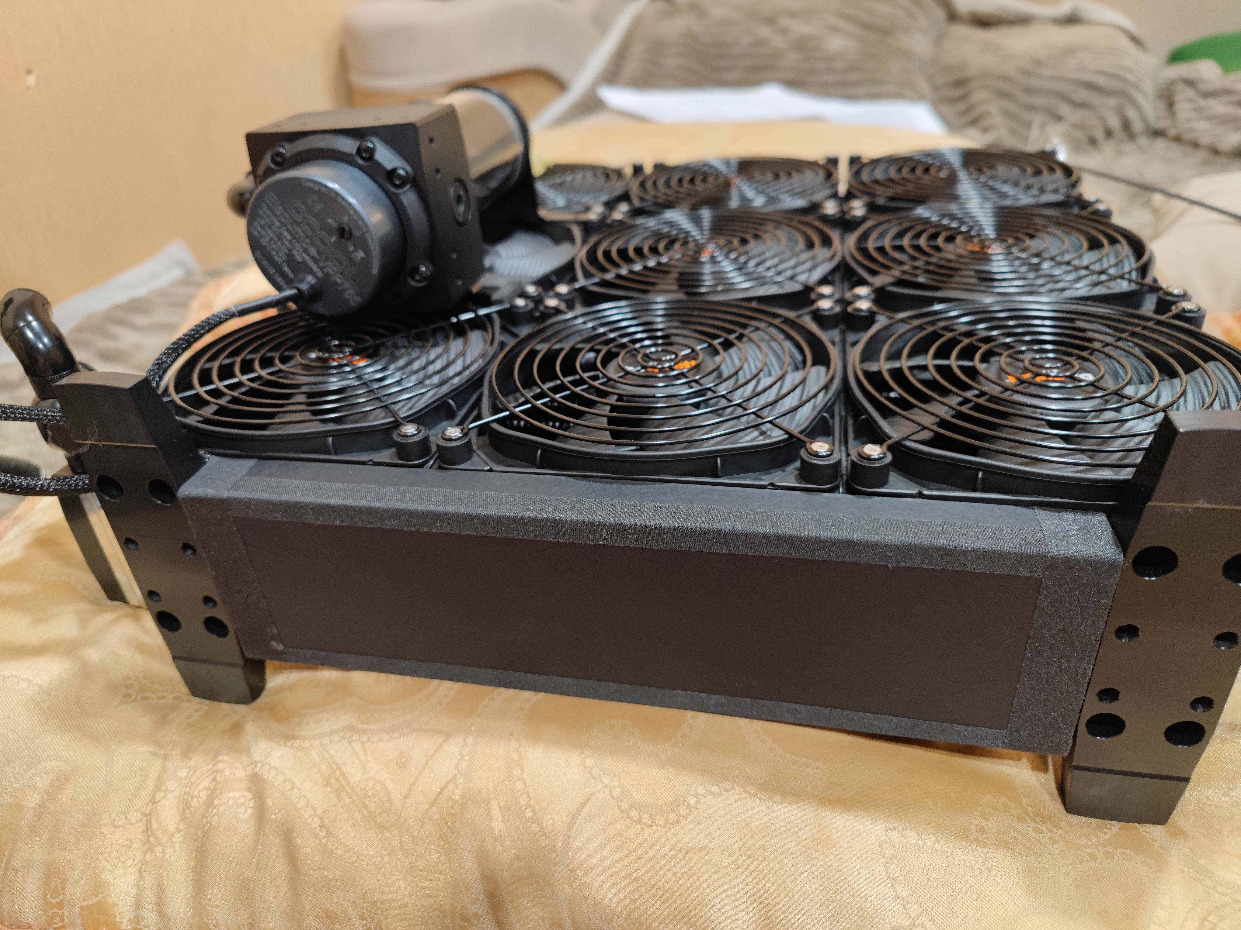 Просили тесты. Значит, сделал по схеме от ув. CHiCHo. А конкретно, убрал фронт радиатор, верхний и нижний радиатор на выдув, на фронт 4 вентилятора. Задний вентилятор так оставил(лень переворачивать его, да и фильтр надо какой-нибудь, чтобы пыли не насосал в корпус). Что в итоге: дельта эмбиент - вода упала на -1 градус. Делаю вывод, что передний радиатор делал только хуже, как и говорил CHiCHo, т.е схема с двумя радиаторами на выдув - рабочая. п.с сейчас жду когда придет недо мо-ра от Bykski B-1080-CEC-X. Уберу вообще все радиаторы из корпуса, оставлю 6 вентиляторов на минимальных оборотах для циркуляции воздуха в корпусе. На Bykski B-1080-CEC-X поставлю нормальные вентиляторы Noctua a12x25 pwm, и две помпы, одна D5 и на Bykski стоит какая-то DDC помпа от EK. Протестирую, напишу будет ли лучше дельта. Да в принципе даже если и будет хуже, оставлю по-любому Bykski. Т.к радиаторы в корпусе надоело чистить, продувать.