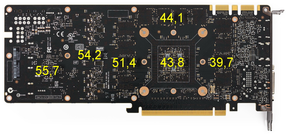 Температуры при прогоне Firestrike combined: комнатная 25.6°, жидкость на входе в системник 30.8°, на выходе - 32.3°, ГП 40.5°. Нагрев PCB измерял пирометром, так что замеры не точечные, а пятном диаметром 12-13мм