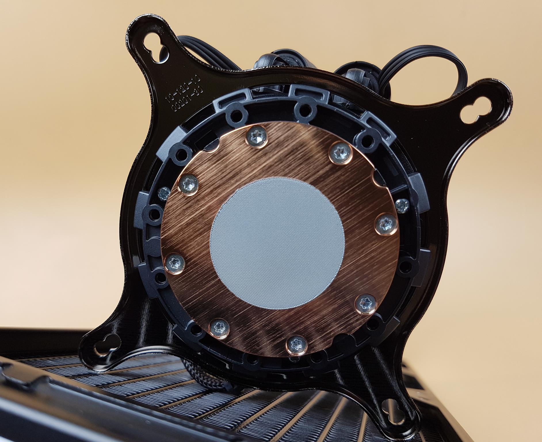 Предварительно нанесенная на основание медной пластины термопаста имеет достаточно густую консистенцию, поэтому в случае с сокетами Intel важно хорошо и равномерно закрутить крепления водоблока, чтобы пятно контакта получилось оптимальным. Для сокетов AMD подтягивается всего один винт крепления и в случае с тестовым стендом пятно контакта получилось хорошим в центре, но слабым по краям. Однако это не повлияло на температуру процессора в худшую сторону. После полной замены термоинтерфейса на Arctic Cooling MX-4 с нанесением по всей теплораспределительной крышке процессора нагрев в стресс-тестах даже немного вырос в пределах 1-1,5 °C. Это говорит о хорошем качестве нанесенной в заводских условиях термопасты.