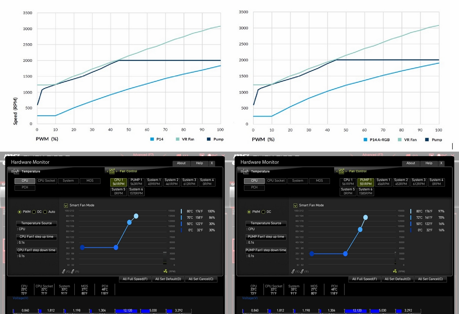 Здесь обычные пэшки и аргб более-менее синхронизированы по оборотам. По кривым арктика как-то сильно завышена в начале кривая обычной пэшки и разница получается вообще несущественная, а у меня получается разница намного больше. Если для обычных пэшек для 550рпм надо 30%, то для аргб надо всего лишь 16%. Чем выше обороты, тем разница меньше, но имея в виду, что помпа выходит на макс при 45% своих родных вентиляторов, то может случиться так, что на обычных пэшках на минимальных для меня 30% и 550рпм помпа уже будет колотить на максимум. Можно ещё такую разницу списать на то, что у меня аргб подключены штатно с помпой и остальным, а обычные пэшки отдельно, хотя и там и сям без хабов, а напрямую к разъёмам материнки, но очень сомневаюсь что вообще в этом может быть дело. Короче, если хочется феншуя, то надо брать ещё три P14argb. Либо оставлять как есть, всё равно не видно, комп под столом витриной к стенке без всяких подсветок