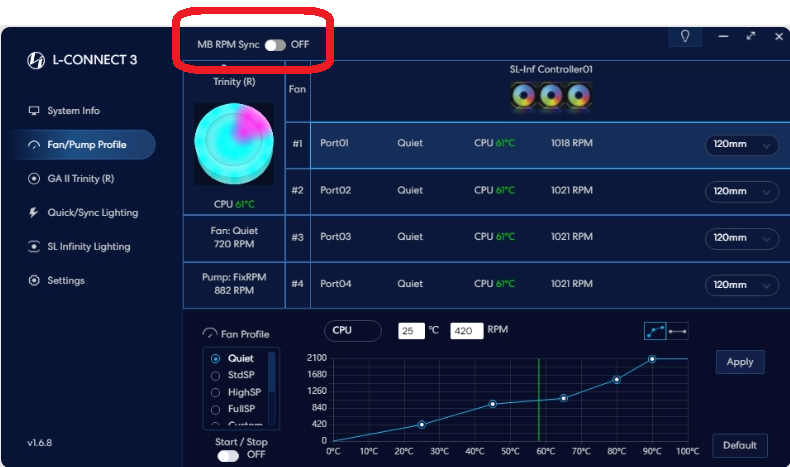 Grigoriy1981 Ползунок оборотов если мы про PWM то да, 100%, в режиме DC 12V. Максималка и при этом 2300. Насчет подключения попробую, сам не додумался бы. А позвольте спросить. Если я отключу 4 pin pwm штекер, то у меня по идее должен быть максимум оборотов? И второй вопрос, если отключу USB то что может негативного случится? Я честно сам не понимаю зачем мне USB в принципе если я L-Connect использовать не собираюсь