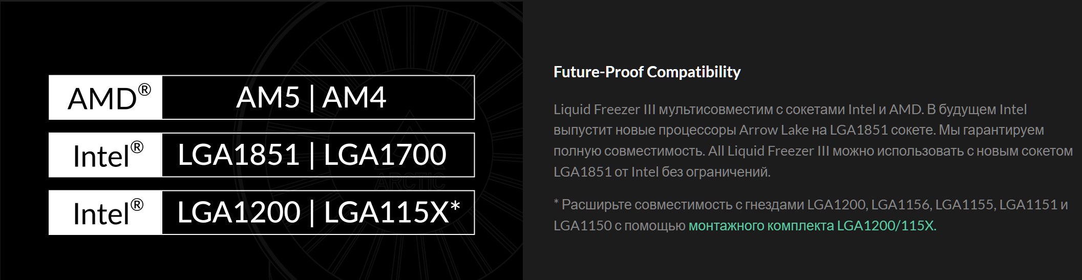 и самое интересное за этот кит: Attention when using with LGA1700 Монтажный комплект позволяет устанавливать Liquid Freezer IIIна LGA1700 гнезда даже без входящей в комплект контактной рамы ARCTIC. Однако делать это не рекомендуется. Независимый механизм загрузки Intel (ILM) деформирует процессор, вдавливая его в сокет в двух точках с весом более 40 кг. При высокой тепловой нагрузке это может привести к долгосрочным проблемам и снижению холодопроизводительности. Поэтому мы рекомендуем использовать входящую в комплект контактную раму со всеми моделями Liquid Freezer III и Freezer 36.