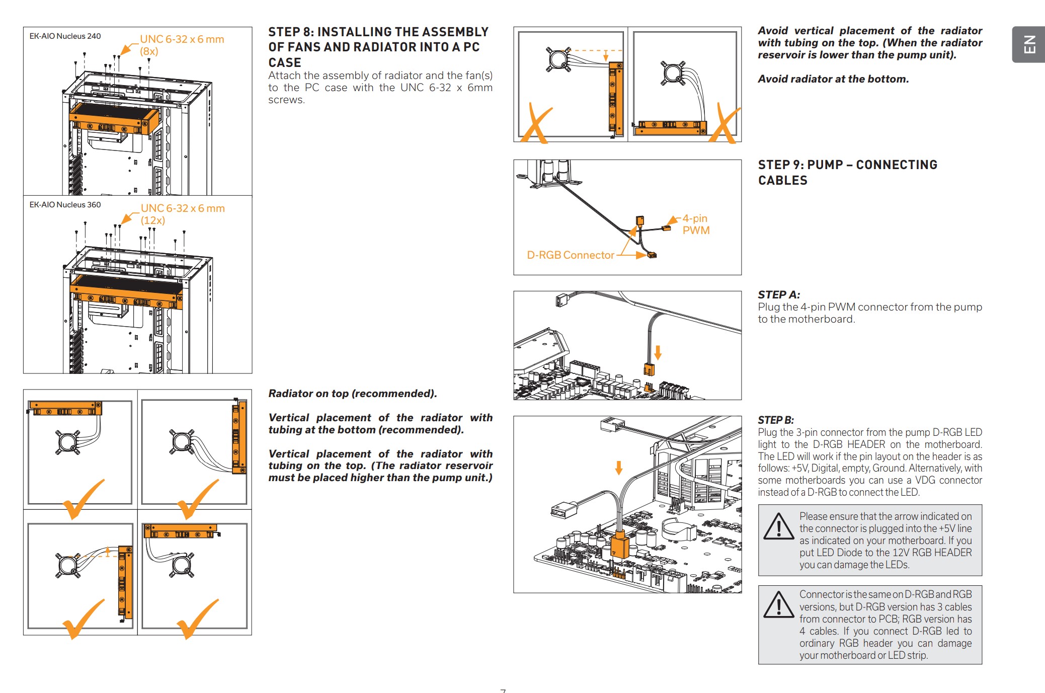 Справедливости ради, если недолив присутствует, то когда радиатор установлен вертикально, то лучше чтобы трубки были ниже уровня помпы, тогда воздух будет оставаться в верхней части радиатора, которая выше уровня помпы и самое главное больше не засасываться снова. Было у меня 3 разных воды на своем открытом стенде и одна из них была как раз трубками наверх, так вот гоняла она воздух очень прилично, слышно по звуку. Сейчас снова трубками вниз и такой проблемы нет.
