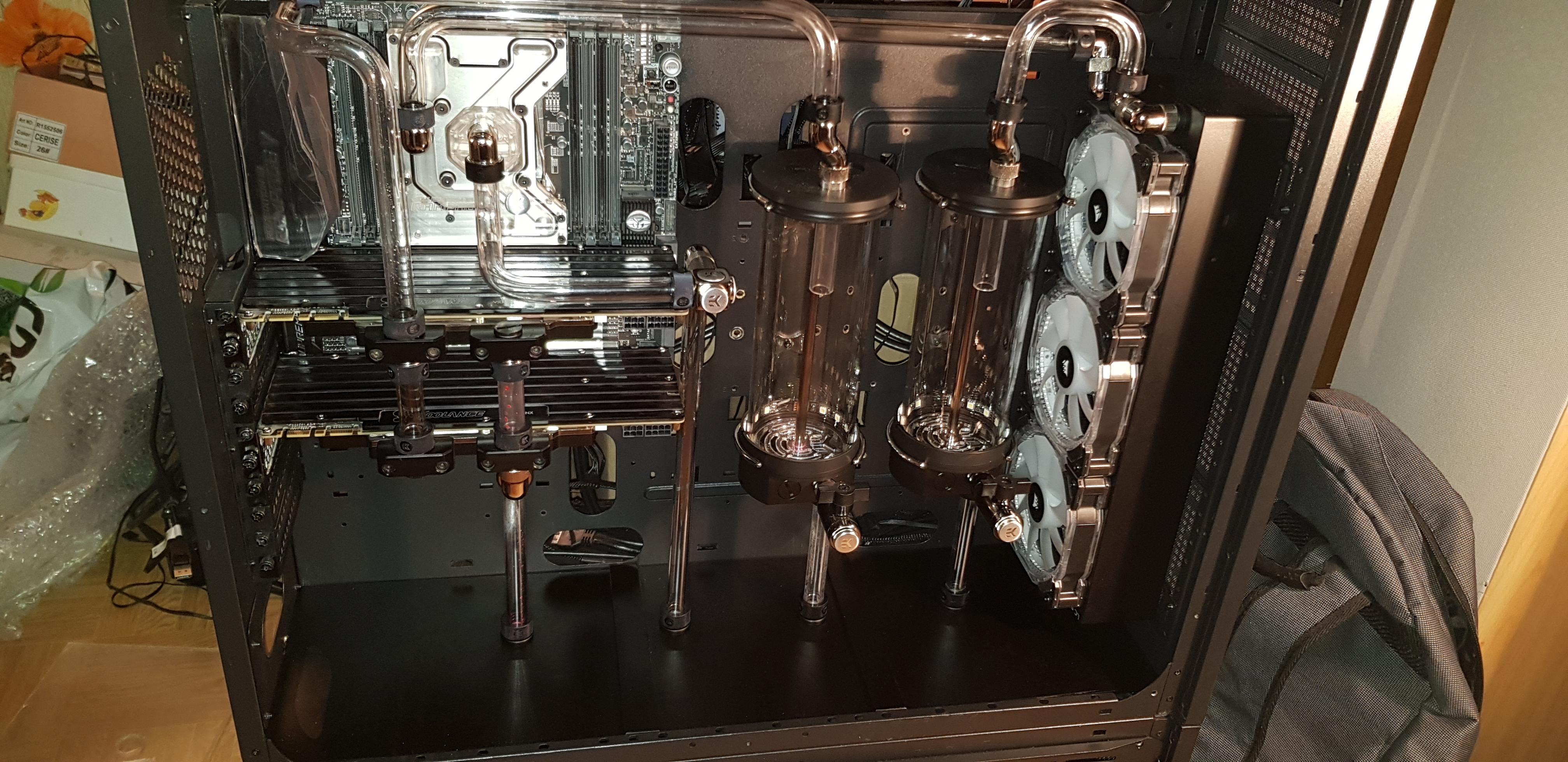 После сборки контура СЖО нужно обязательно проверить его на течи: обмотать места соединений бумажными полотенцами или салфетками, заправить, запустить в тестовом режиме (запустить только помпу от отдельного БП), достаточным временем проверки можно считать 12-24 часа. Если кто-то желает добавить что-либо - пишите в ЛС куратору темы.