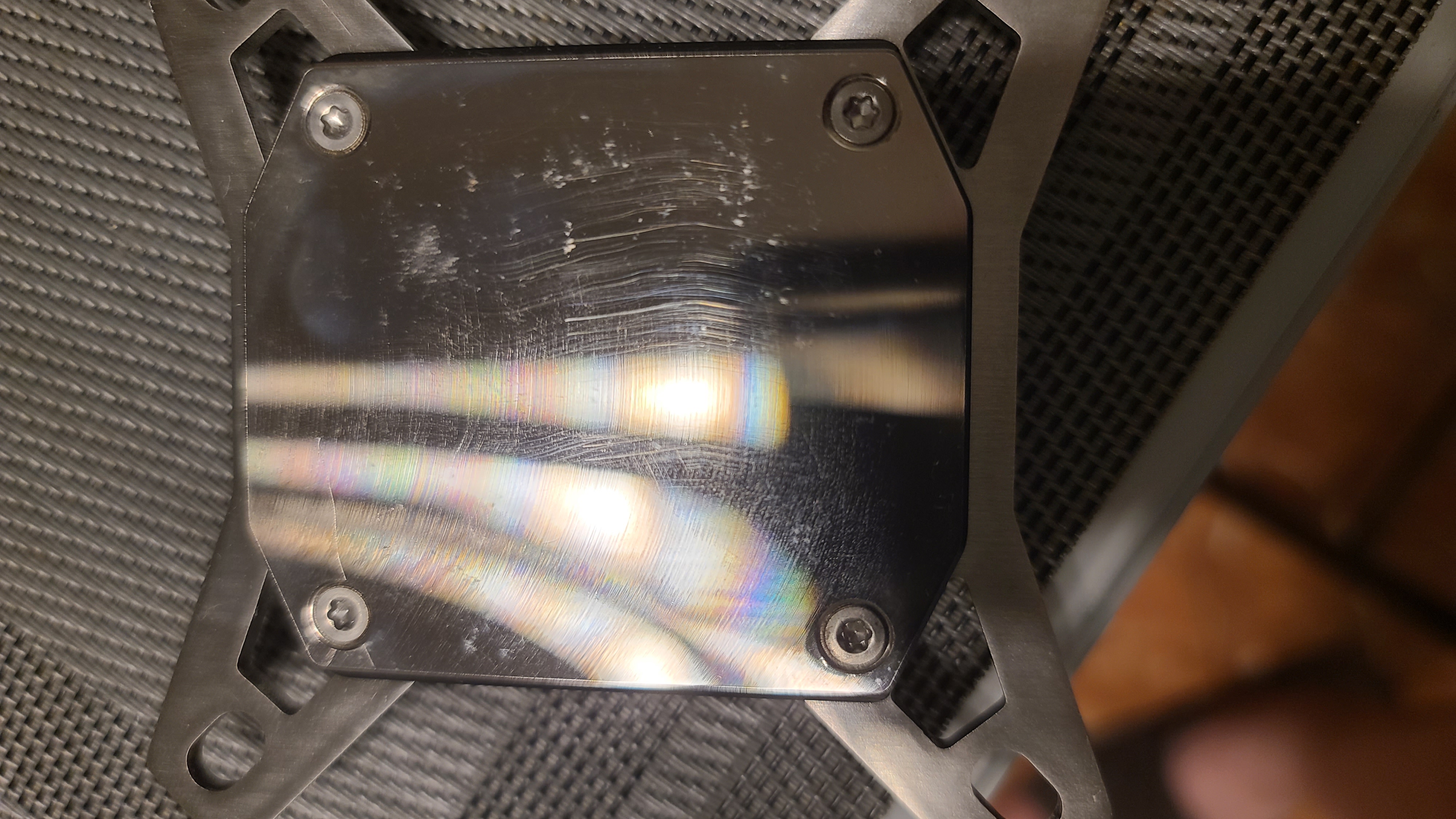 Снял я вб для спиливания концов креплений. Снял термопасту картой. Когда всё закончил стал оттирать и прозрел. Поцарапать умудрился картой пластиковой и какие то пятна. Что за емана? Было зеркало девственное.