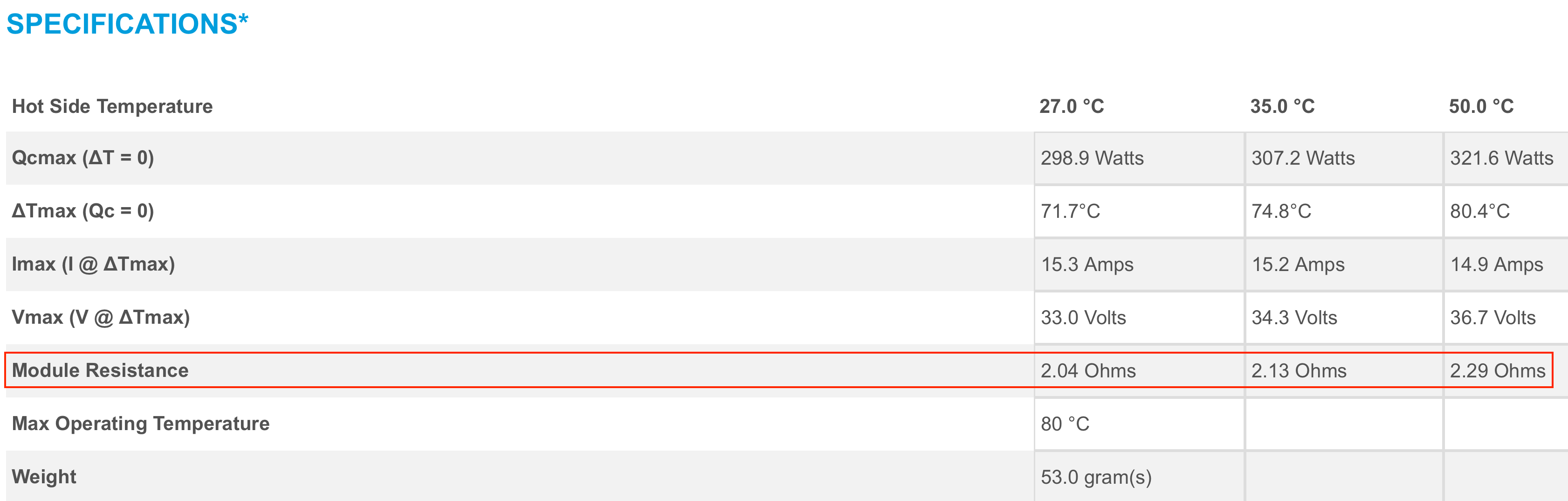 Нельзя говорить об Омах когда речь о полупроводнике. Современные элементы Пельтье - полупроводниковые модули. Там есть кривая падения напряжения в зависимости от тока - ВАХ. То есть при таком-то токе на модуле будет падать столько-то напряжения. Для справки, 2 Ома при 12 Вольтах это всего 72 Ватта (P=(U^2)/R).