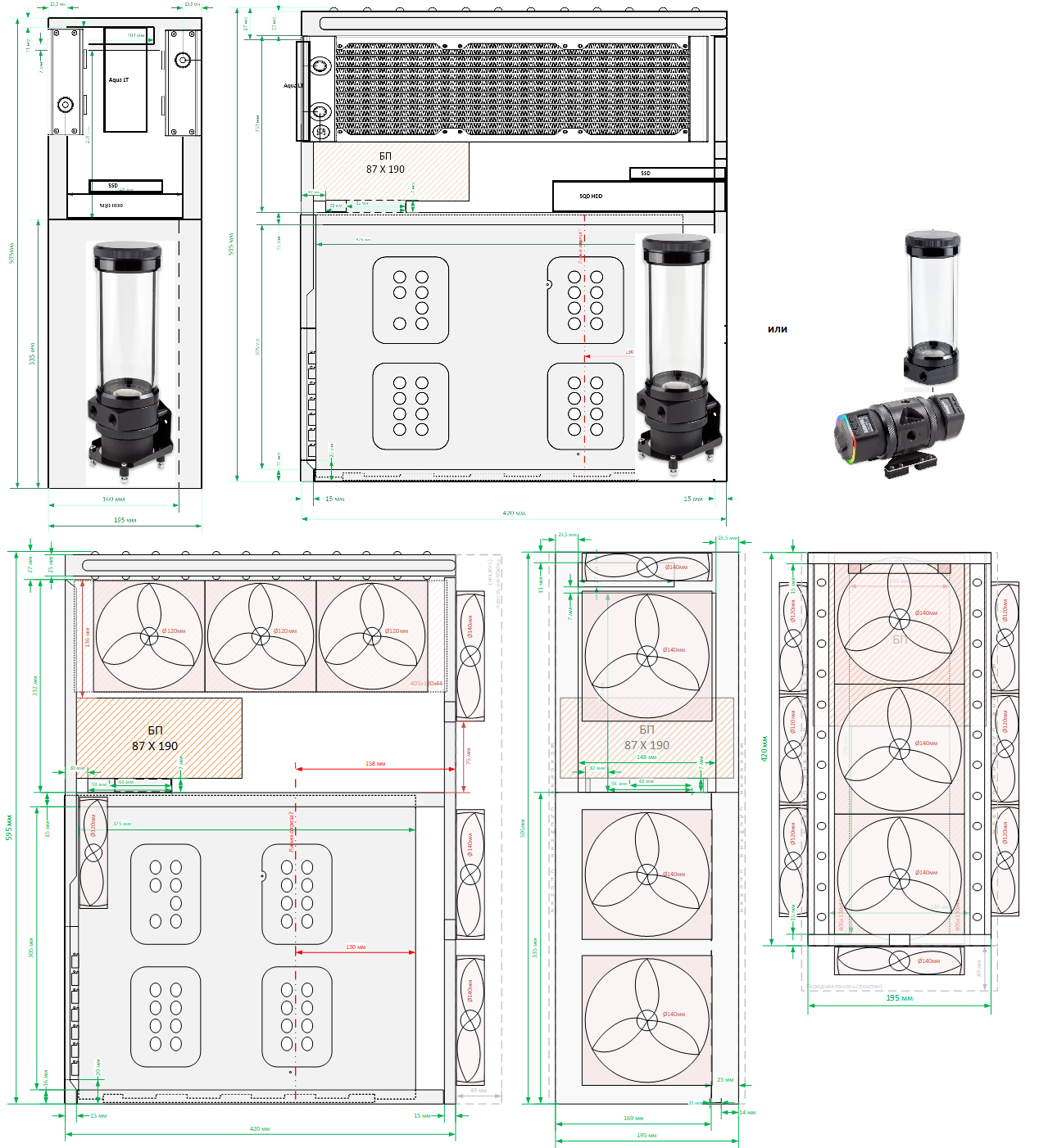 Спереди сверху не вижу смысла ставить вентилятор на вдув, но под ним будет HDD в SQD + SSD (можно убрать на крышку МП). На задней стене дырку сверху не вижу смысла делать и ставить вентилятор. Там плата Aquacomputer 5 LT хорошо встает.