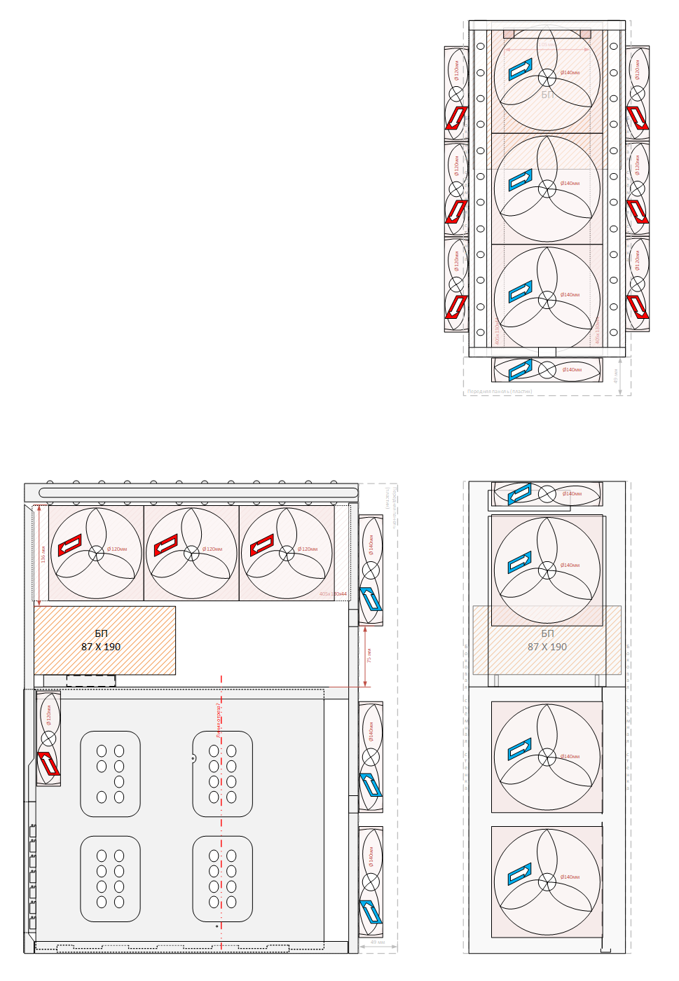 бп можно не двигать, но в крышку только 30мм встанет (венты придется сверху ставить). но у меня сомнения, что 3 радиаторам (9 х 120) хватить свежего воздуха от 3 х 120 (2 спереди и 1 сзади), так очень компактно будет, но возможно не эффективно.