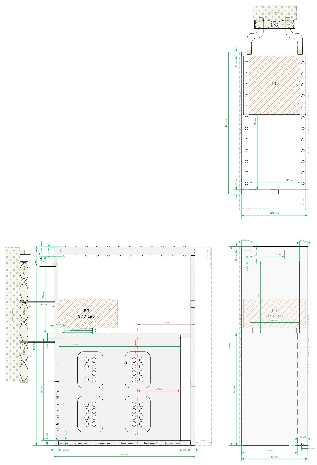 Получившийся верхний объём забить только радиаторами с вентиляторами. В нижнем объёме разместить всё остальное. Вот так будет наиболее правильно и грамотно.