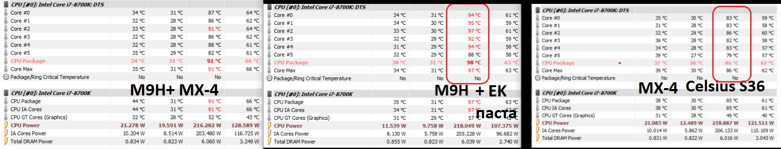 По поводу прокладок на VRM. Радиатор моноблока прилегает к ним довольно плотно, сразу это заметил, когда чуть приподнимал моноблок, и они сразу прилипали к нему.[именно с мосфетов прилипали, там оставил со штатного радиатора, подрезал только немного, а на дроссели накинул из комплекта одну полоску]. Прижим к VRM отличный получился, а вот к процу и не прилегает толком..Прокладку накину на проц в след. раз и посмотрю разницу..Ну либо MX-4 потолще намажу, посмотрим. Сначала еще раз гляну на отпечаток.. Но там прижима реально не было. То есть отпечаток такой, как будто легонько соприкоснулись поверхности, даже не поддавило ни в одну сторону за пределы отпечатка, да и неполный контакт видно. Сейчас просто подзатянул на полную..но не хватило все-равно. Разница в 12 градусов по самым горячим ядрам..