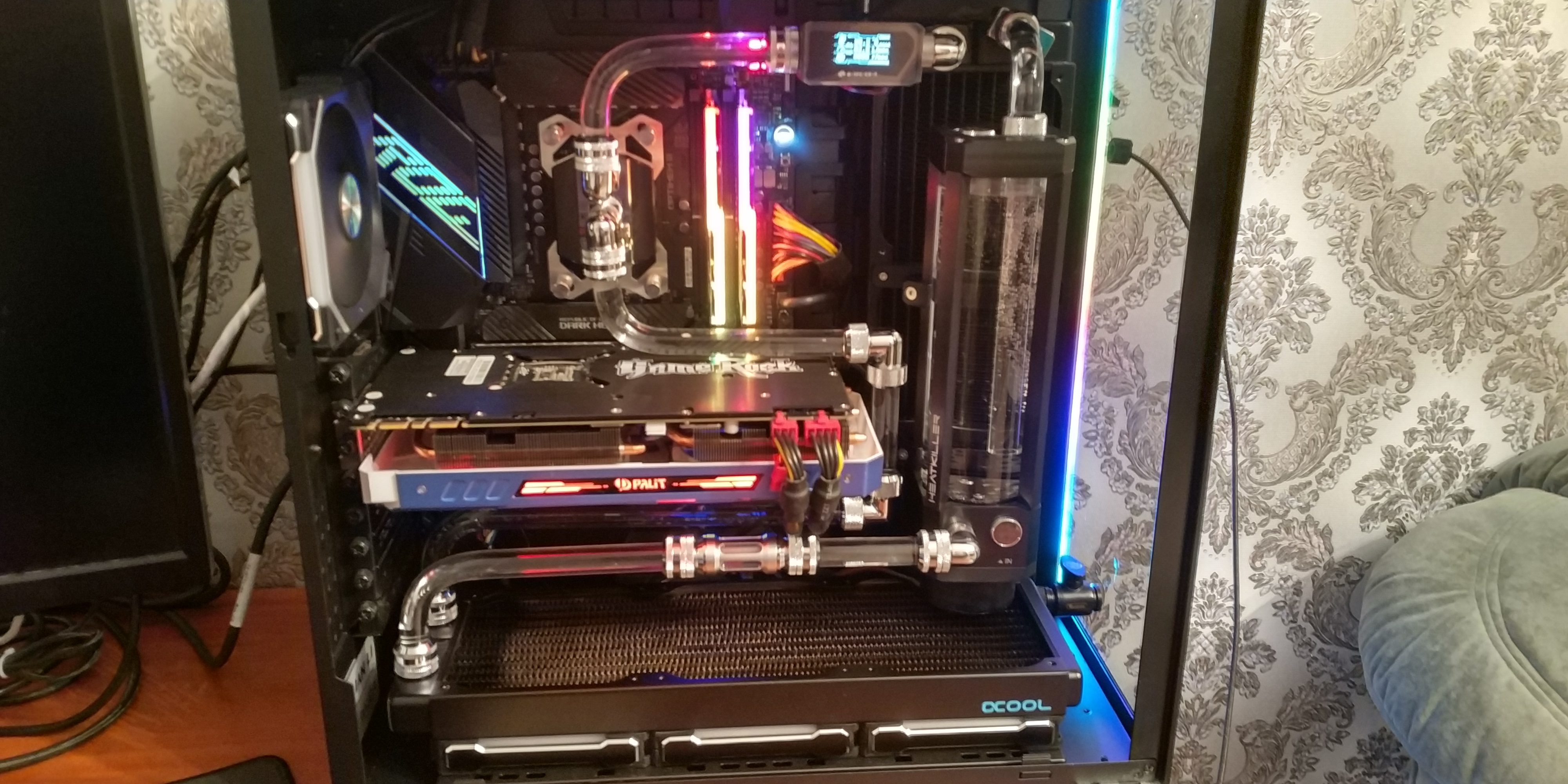 Достойно. Никак себя не уговорю купить на МОРу сетку и ножки, чтобы закрыть кабель от вентилей. Вопрос по сплиттеру для вентилей. По виду вроде deepcool, много читал, что горят при более чем 4 вентилей в нагрузке. Как опыт И комментарий по трубкам - люблю ковыряться (менять видеокарту, систему в целом раз в 1-2 года), сначала тоже делал на стекле или металле трубки, потом понял, что скорость разбора критична для меня, так и гибкими ограничился, хотя пара комплектов лежит готовая для сборки на металле и акриле.