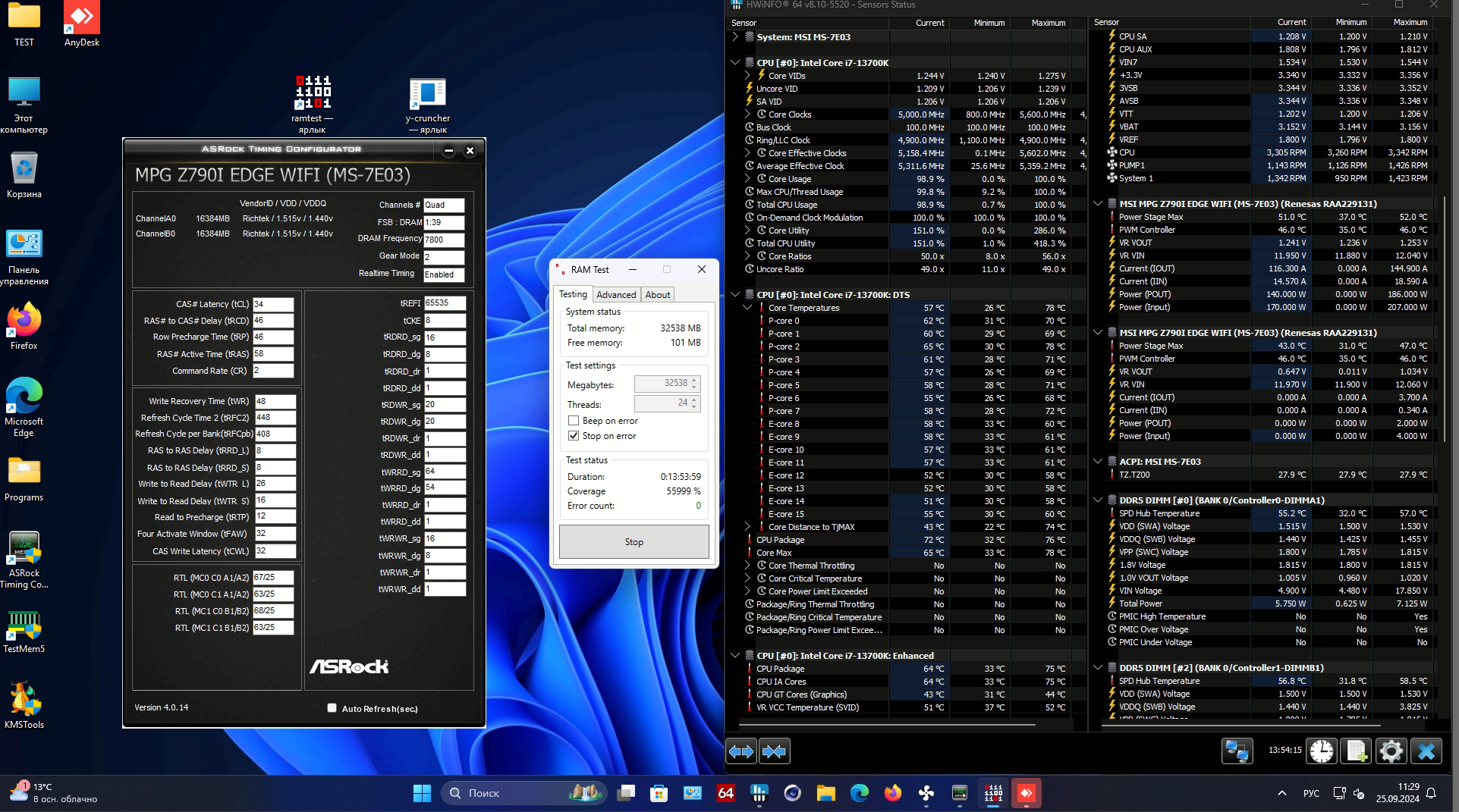 Купленный на старте продаж Ай9-12900К, мог 5000/4000 при 1.22(в линХ), под кулером за 3000р... С 13900К не повезло... Не гонится, для 5600 надо уже 1.27...
