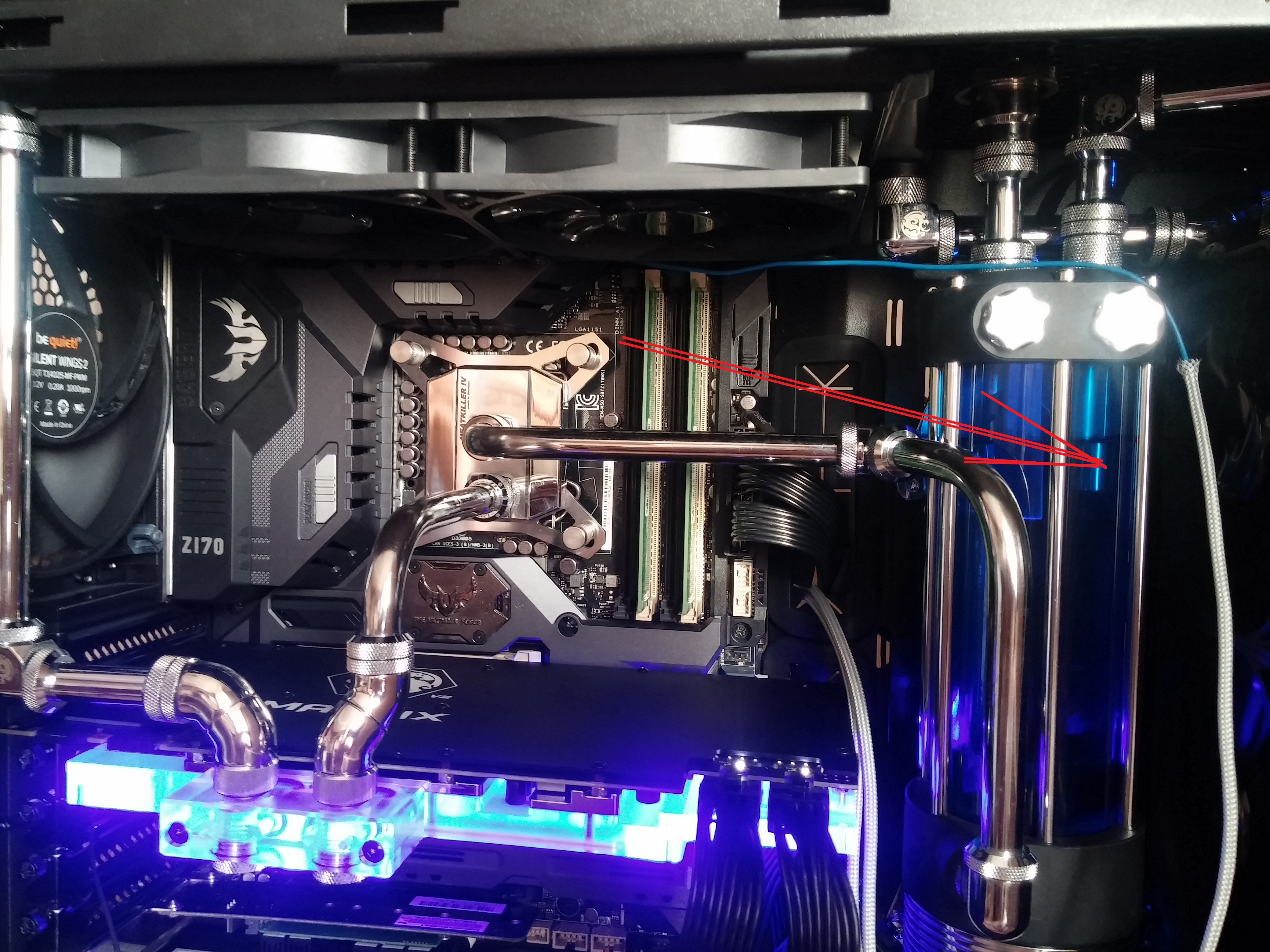 Справа вертикально смонтирован тонкий 280 мм, вверху горизонтально - толстый 360 мм. Помпа справа внизу закутана в бумажное полотенце. Может, есть какой-то трюк, чтоб избавиться от остатков воздуха?