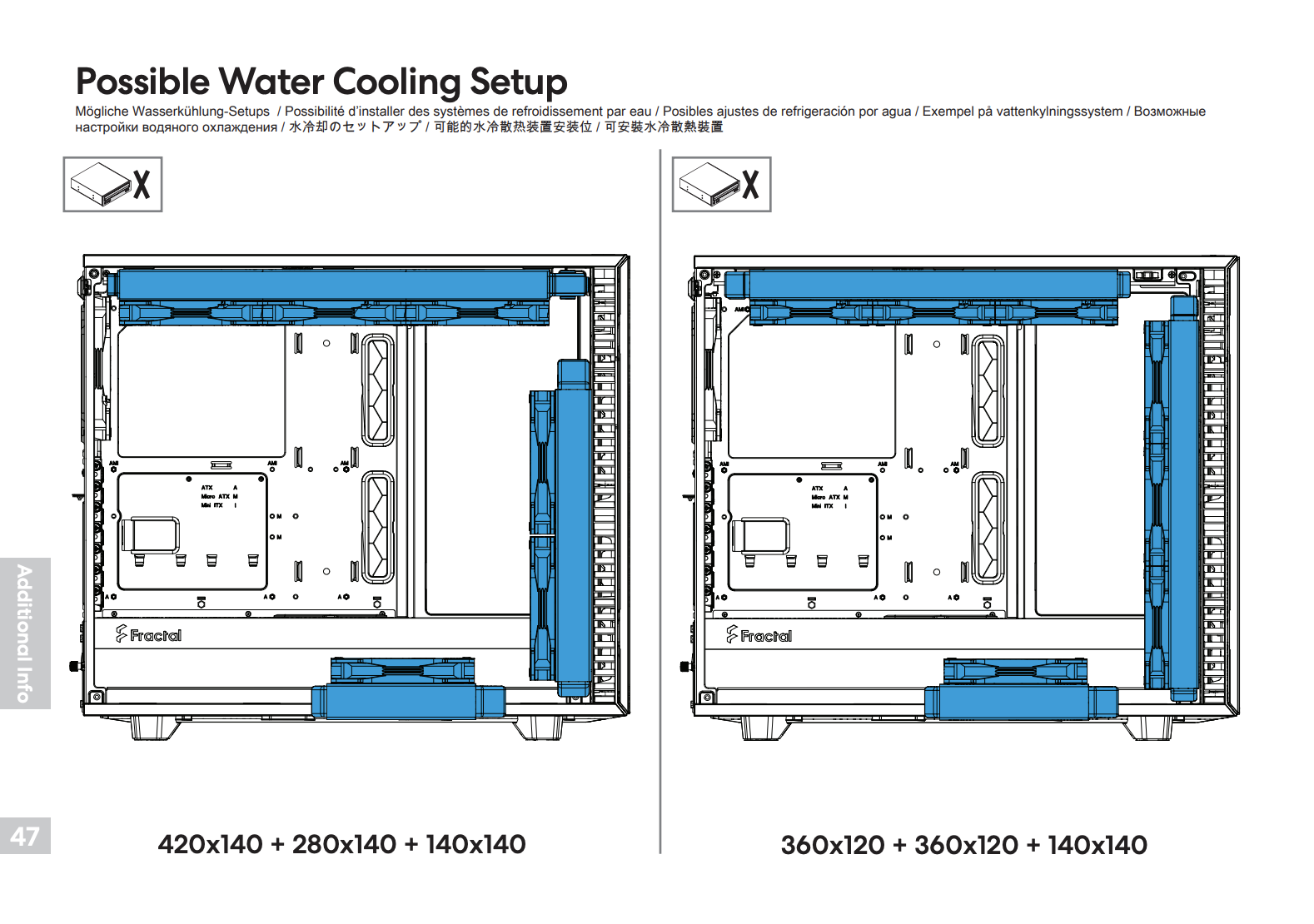 Это надо мерять самому, либо узнавать у тех, у кого есть этот кейс. Я тоже присматриваю себе один кейс, и хотя в спеках указано какие рады влезают, непонятно какой толщины рады можно будет заюзать, как будет с доступностью портов на радах если поставить такой-то толщины.. сижу изучаю вот. А лучше самому положить руки на корпус и померять. В вашем случае, судя по спекам этого фантекса, 480 или 420 плюс 2 шт по 360 мм должны влезть. Лучше юзать 420 мм вместо 480.