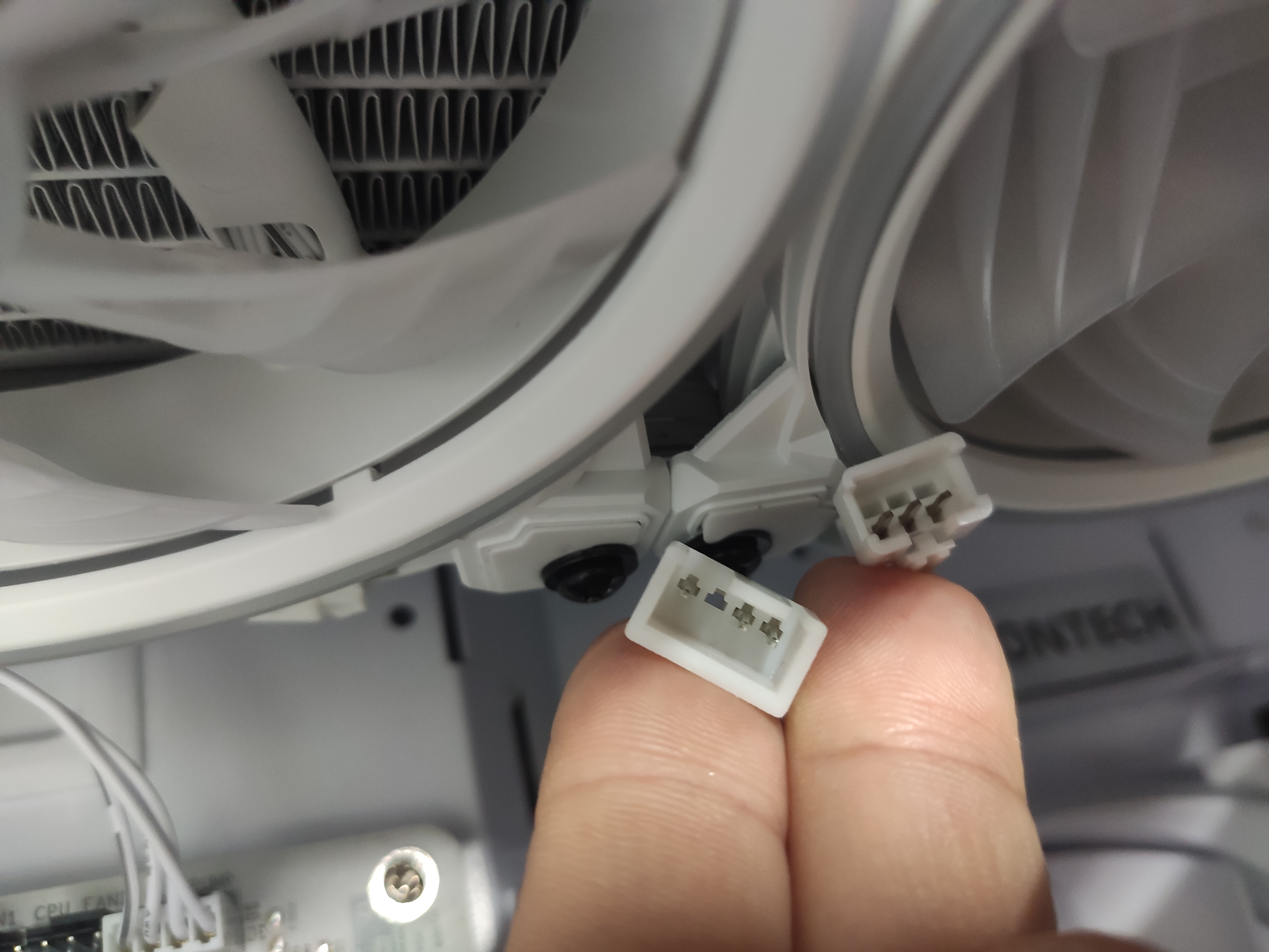 Какой раздвоенный? ARGB который? Его в общую косу с вентиляторами соединяй, и подключай к 9 на плате. Но можешь и по отдельности, например помпу к 9, вентили к 10. Тогда подсветку помпы и вентилей будешь по отдельности настраивать.