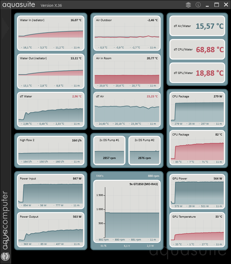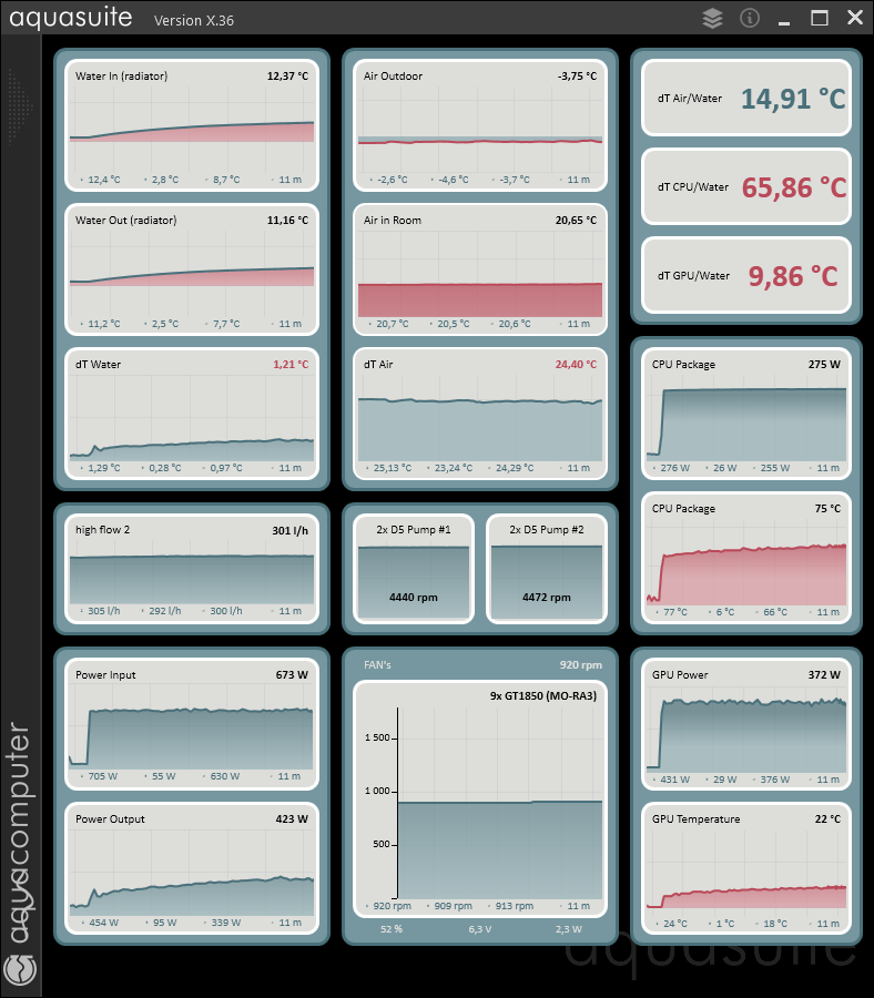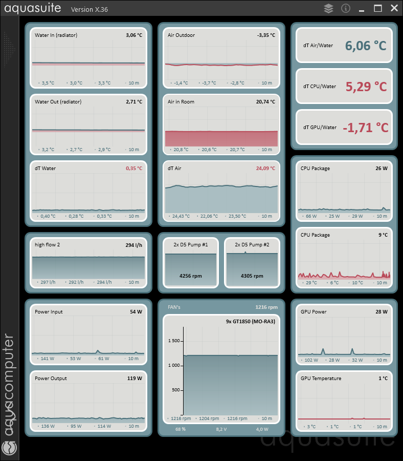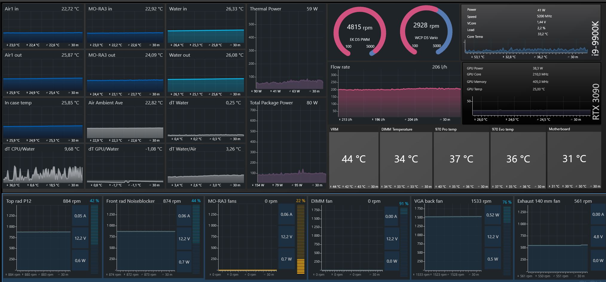 Если хочешь, давай попробуем разобраться. Скрин что ты скинул ни о чем вообще. У тебя есть настроенная страница в аквасьюте с главными датчиками? Нужно вывести датчик дельты воды и рассеиваемой мощности среди прочих. Покажи при бездействии системы, как тут, а потом поиграй в то же метро или любой тест с хорошей нагрузкой и кидай мониторинг с графиками. Там будет видно сразу все что нам нужно узнать. Сможешь?