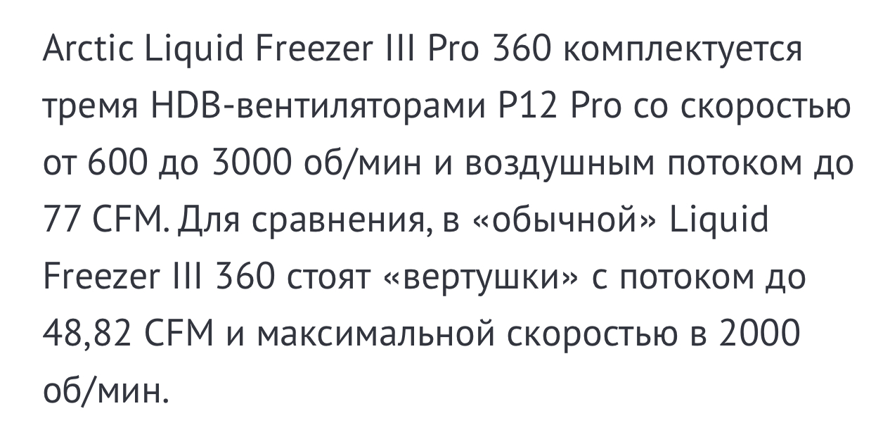 Все правильно, это достигается за счет более эффективных вертушек которые лучше охлаждают радиатор, во всем остальном они одинаковые, если на обычную поставить вертушки от про результат будет такой же и вот чудо то какое И так смотри , у кулера есть параметр CFM(это единица измерения воздушного потока) пишиться как правило для максимальных оборотов кулера, так вот смотрим фото обычный фризер 48.8 при 2000оборотах в про стоят кулера P12 pro у которых этот параметр (CFM) составляет 77 но уже при 3000 оборотах, я же установил кулер который может CFM 64.5 и это на 2000оборотах что не плохо) так что тот же pro как ты говоришь (кулер потише сделать) будет выдавать поток меньше чем те что у меня сейчас стоят на комфортных оборотах Ps: А если сделать бутерброд из кулеров(стандартных) на радиатор то обычный фризер будет отводить еще больше тепла чем даже pro, получается уже супер про будет