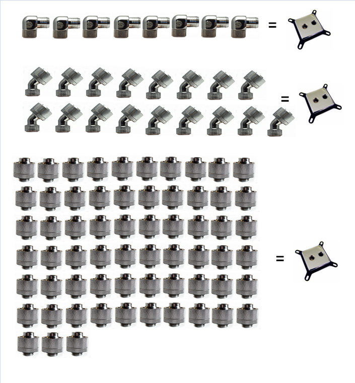 Добро пренебречь разумным кол-ом этих адаптеров(Enzotech RCPS-G1/4-12 90°) при двух насосах --- не, ну конечно если вы Перфекционист и нужен ультимативный Один Галлон расхода то конечно, эти адаптеры нанесут какой-то ущерб производительности контура... Правда какой это будет ущерб скажите Нам вы, ежели пожелаете заморочиться... Но смею заметить, что Водяные зачастую склонны преувеличивать значимость большого расхода теплоносителя в контуре СВО-компьютера... Я бы не парился, честно... точнее говоря я и не парюсь при наличии нескольких насосов...