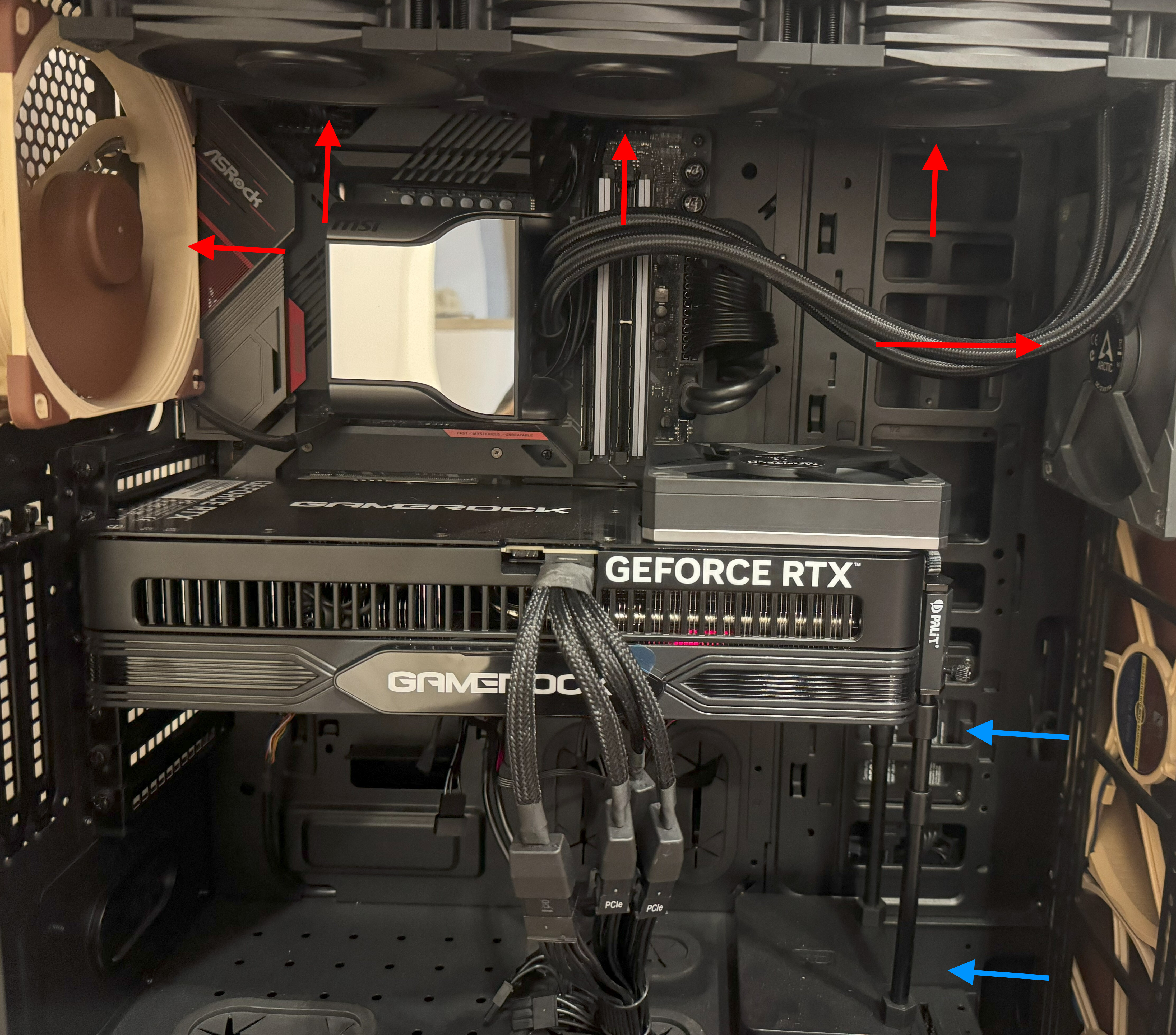 Ну можно перенести СЖО на фронт, 20Ки на выдув, под видеокарту вывести 140мм вертушку с забором воздуха извне. По приходу воздуха: приход 14см+2Х20см - это приличный приход. Я так понимаю есть еще вариант собрать кастом контур под процессор и вывести его в нижнюю часть корпуса убив всех зайцев )
