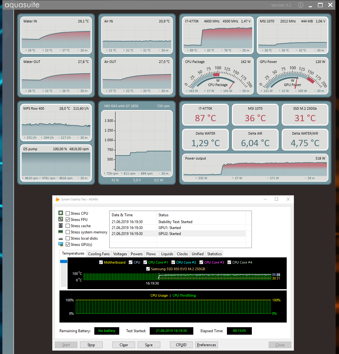 Вопрос, на который если дадите ответ, то продолжим полемику... какая у вас температура воды на входе и выходе из радиатора при нагрузке? PSSS: вижу по скринам, что... у меня внутренний датчик mps flow показывает - 28,0°С, увас - 39,5°С... это так, к слову