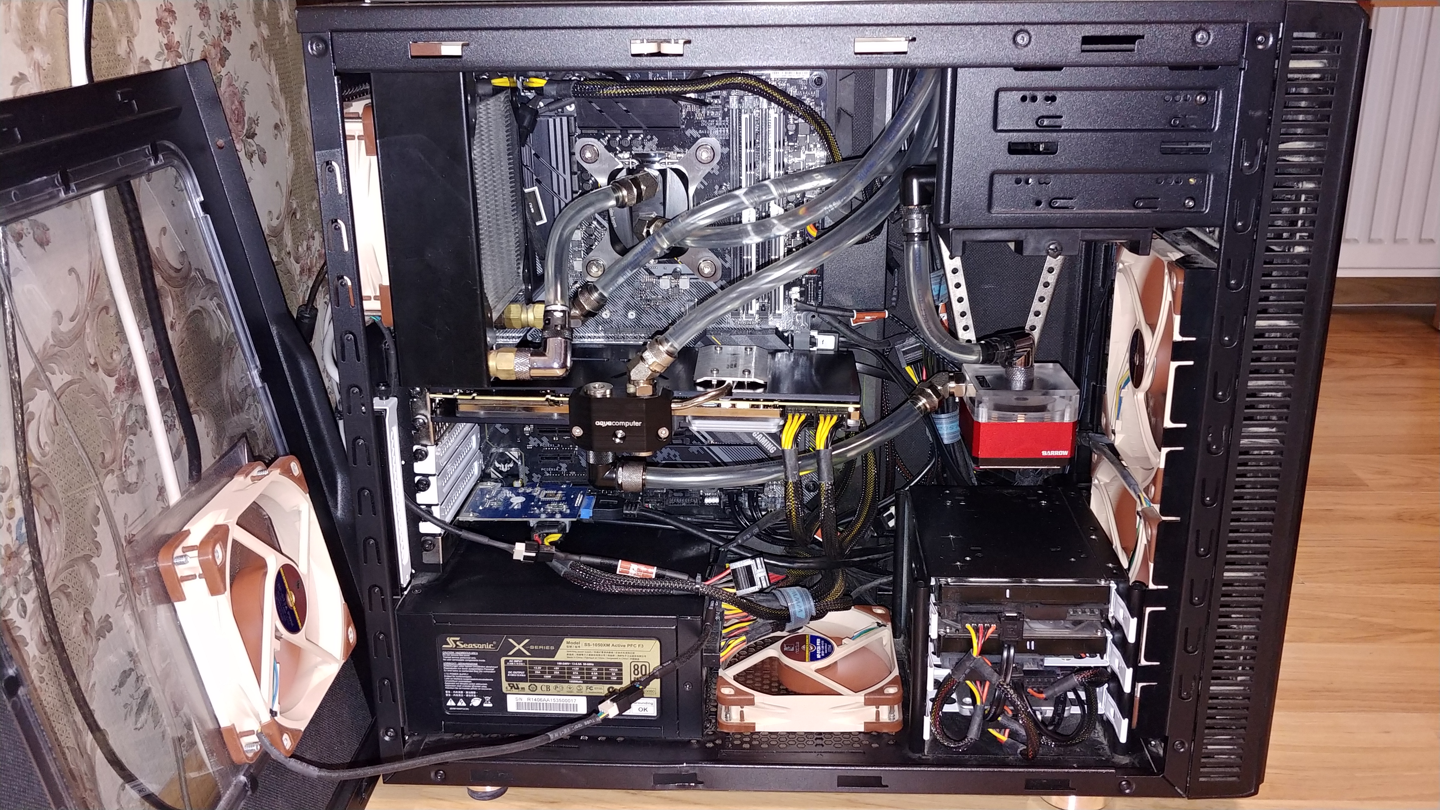 В начале года пересобрал контур. После попереворачивал радиаторы с помпой на максимум, вроде весь воздух вышел(ничего не булькало). Затем прогрел и закупорил. Сейчас глянул, на вб видеокарты чернота появилась.